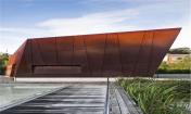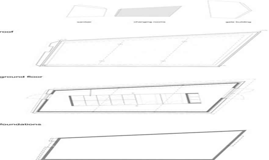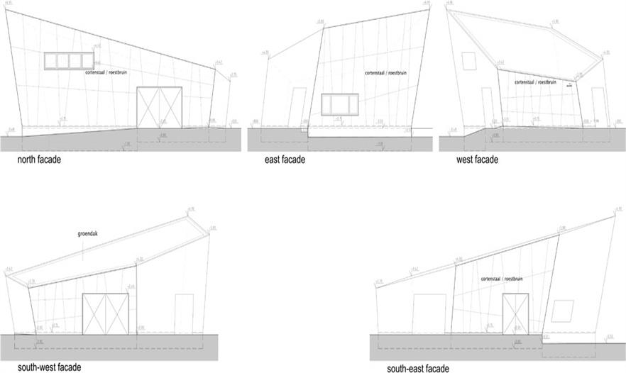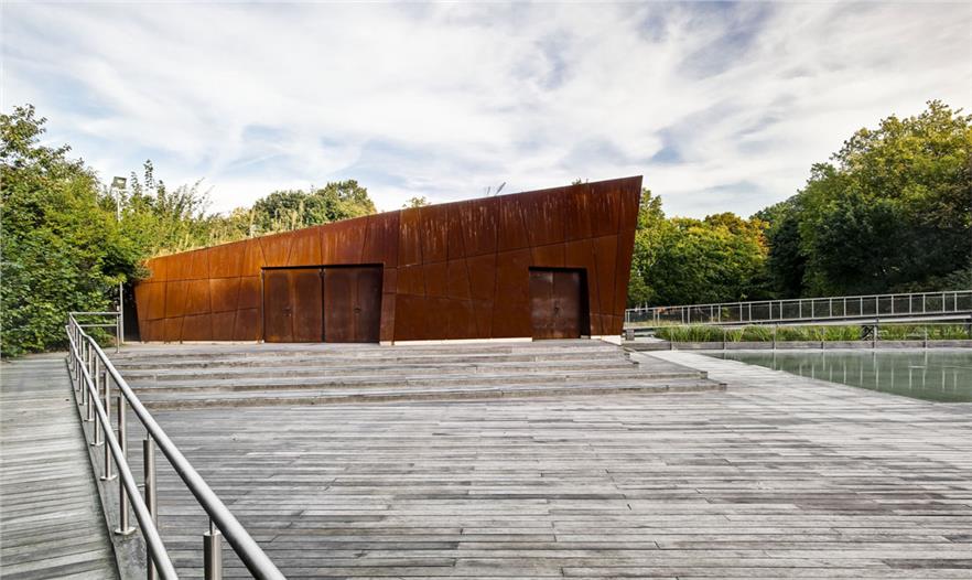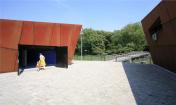 同時,在濱水區(qū)的另一側(cè)是三個與環(huán)境相協(xié)調(diào)的景觀構(gòu)筑物。它們由一群的獨立藝術(shù)家創(chuàng)作。構(gòu)筑物激發(fā)了游客對奇特的巖石造型的感知意象,這種形式經(jīng)常出現(xiàn)在18世紀(jì)漢斯•古德或彼得•巴克的作品中。構(gòu)筑物之間的空隙,如同懸崖之間的裂縫,在湖水的對面自然的形成了原始樹林的觀感效果。