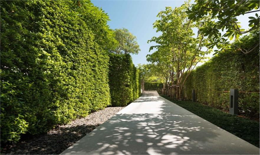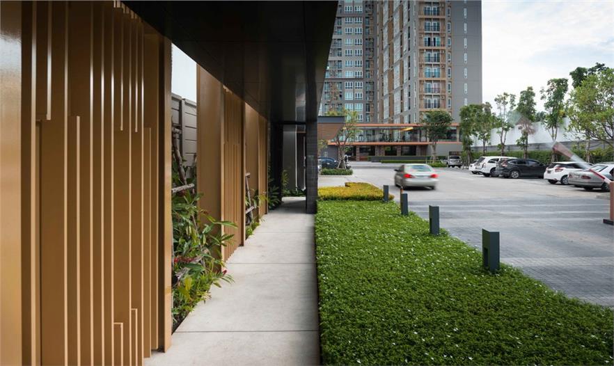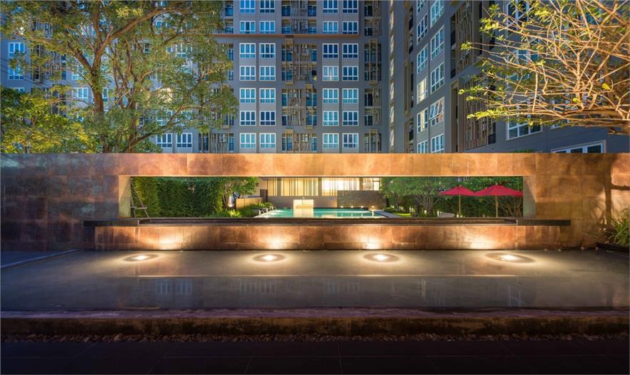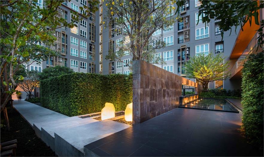 The Key Sathorn – Ratchapreuk位于曼谷吞武里區(qū),是一個(gè)擁有超過(guò)800個(gè)公寓的居住小區(qū),由三座公寓樓和一個(gè)停車場(chǎng)組成。這里鬧中取靜,交通便利,離曼谷的Wutthakart BTS火車站不遠(yuǎn)。小區(qū)的居住密度偏高,這種高密度住宅的戶外活動(dòng)區(qū)域通常被放置到小區(qū)最顯眼的位置,以促進(jìn)公寓銷量。但這次景觀設(shè)計(jì)并非從經(jīng)濟(jì)角度出發(fā),而是意圖為在此居住的居民打造一個(gè)舒適怡人的戶外環(huán)境,并保證他們的私人生活不受外界干擾。設(shè)計(jì)著重于空間氛圍的營(yíng)造。方案采取了小組團(tuán)的形式,將不同的功能區(qū)拆散安置在場(chǎng)地的不同角落?;▓@式布局讓空間節(jié)奏疏密有致,同時(shí)也限定了每一個(gè)區(qū)域的邊界,保證在其中活動(dòng)的居民的隱私。