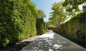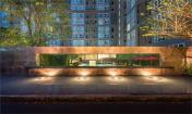 在場(chǎng)地的主入口處,大堂占據(jù)了視覺的中心位置。經(jīng)過(guò)精心修建的灌木整齊地排列在路邊,和步行長(zhǎng)廊一起引導(dǎo)著人們前行。大堂入口處水平延伸的矮墻和矩形灌木叢造型簡(jiǎn)潔,仿佛在歡迎著人們回家。由于場(chǎng)地規(guī)模的限制,游泳池只能被安排在大堂背后臨近入口的地方。為了保證內(nèi)部空間的私密性,設(shè)計(jì)師在兩個(gè)區(qū)域之間添置了一道水景墻,將入口大堂和泳池從空間上劃分開來(lái)。但與此同時(shí),視線仍可透過(guò)景墻到達(dá)泳池末端和公寓底層部分,空間趣味十足,連貫性也得以延續(xù)。
