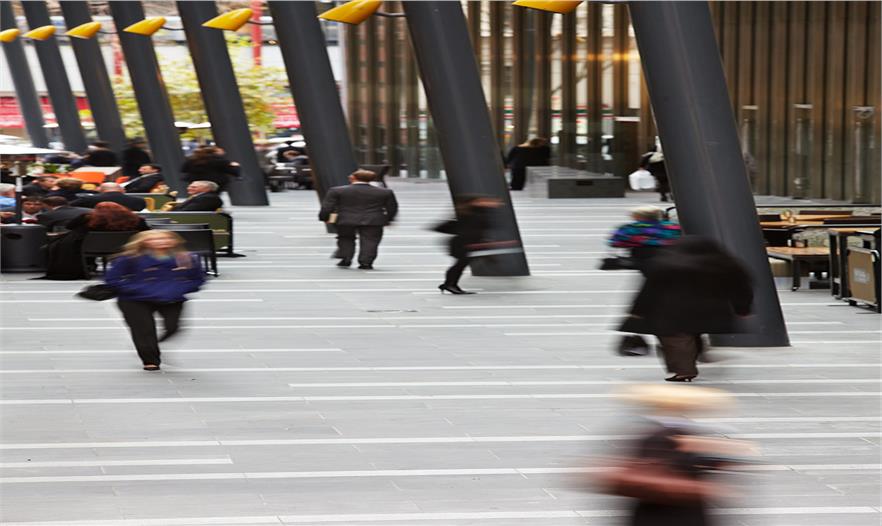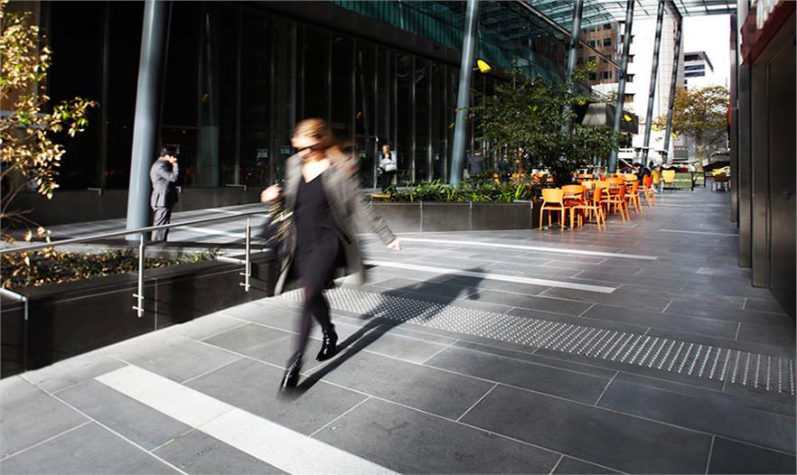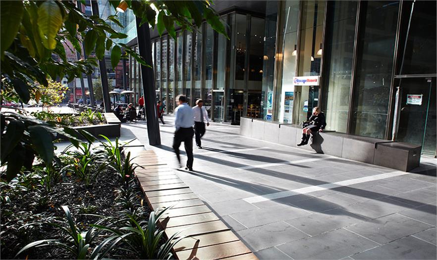 墨爾本南極星商業(yè)街的景觀設(shè)計使用青石板作為主要的鋪地材料,與周邊街道的材料保持一致。青石板是墨爾本小巷最常見的材料。設(shè)計師從建筑外立面玻璃幕墻的外觀著手,在鋪地上通過有節(jié)奏韻律感花崗巖條紋與青石板搭配,既形成了商業(yè)街鋪地的質(zhì)感,又保證整個建筑與景觀的統(tǒng)一。 商業(yè)街上設(shè)有一個綠島,由兩個抬高的植物池組成。植物池的收邊設(shè)有硬木,供購物者乘坐休息。綠島中種有澳大利亞本土生命力極強的小喬木W(wǎng)aterhousea,如同一把綠色的傘,為下層的地被植物營造一個更好的生長環(huán)境。這兩個植物池的選址非常的巧妙,讓人車自然的形成分流。