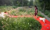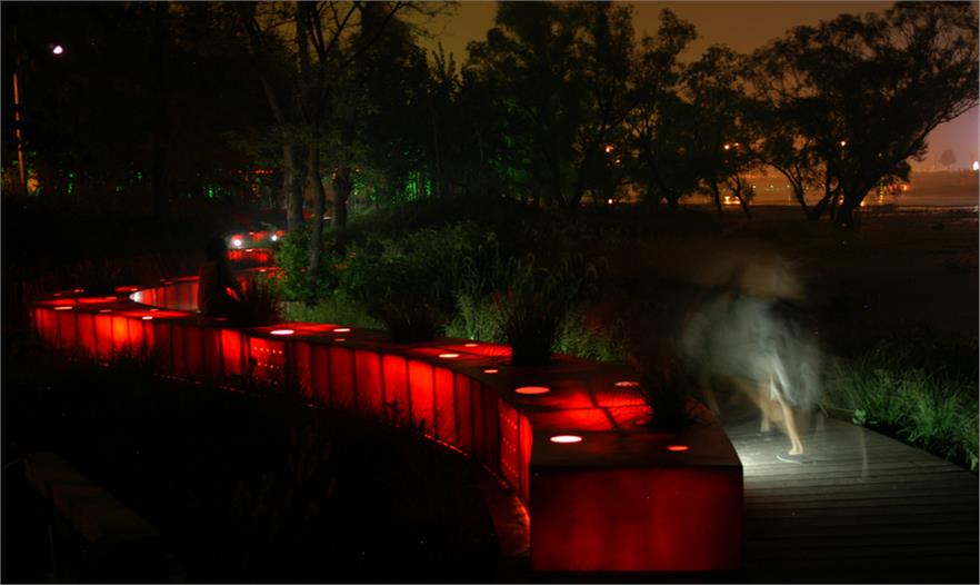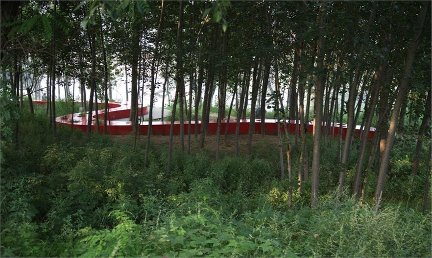 為健全上述生態(tài)服務(wù)功能,以俞孔堅教授為首的北大和土人設(shè)計團(tuán)隊提出“紅飄帶”設(shè)計方案,很快被當(dāng)?shù)仡I(lǐng)導(dǎo)和園林局所采納,并在很短時間內(nèi)付諸實施。設(shè)計最大限度地保留場地原有的鄉(xiāng)土植被和生境,在此綠色基地上設(shè)計了一條綿延500多米的紅色飄帶,整合了多種城市功能:它與木棧道結(jié)合,可以作為座椅;與燈光結(jié)合,而成為照明設(shè)施;與種植臺結(jié)合,而成為植物標(biāo)本展示廊;與解說系統(tǒng)結(jié)合,而成為科普展示廊;與標(biāo)識系統(tǒng)相結(jié)合,而成為一條指示線。它由玻璃鋼構(gòu)成,曲折蜿蜒,因地形和樹木的存在而發(fā)生寬度和線型的變化;中國紅的色彩,點(diǎn)亮幽暗的河谷林地。沿紅飄帶,分布四個節(jié)點(diǎn),分別以四種鄉(xiāng)土野草為主題。每個節(jié)點(diǎn)都有一個如“云”的天棚。網(wǎng)架上局部遮擋,有虛實變化,具有遮蔭、擋雨的功能。夜間整個棚架發(fā)出點(diǎn)點(diǎn)星光,創(chuàng)造出一種溫馨的童話氛圍;斜柱如林木;地上鋪裝呼應(yīng)天棚的投影;在這天與地之間是人的活動和休息空間和鄉(xiāng)土植物的展示空間。