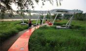 秦皇島市湯河公園位于中國著名濱海旅游城市秦皇島市區(qū)西部,坐落于湯河?xùn)|岸,長約1公里,總面積約20公頃。項目由北京土人景觀與建筑規(guī)劃設(shè)計研究院和北京大學(xué)景觀設(shè)計學(xué)研究院設(shè)計,秦皇島市園林局組織施工并管理實施。一個優(yōu)美的名字:“綠蔭里的紅飄帶”給這個公園很好的注解:用最少的人工和投入,將地處城鄉(xiāng)結(jié)合部的一條臟、亂、差的河流廊道,改造成一處魅力無窮的城市休憩地,一幅幅和諧社會的真實畫面,生動地在生態(tài)場景中展開。設(shè)計最大限度地保留原有河流生態(tài)廊道的綠色基底,并引入一條以玻璃鋼為材料的、長達(dá)500米的“紅色飄帶,”它整合了包括步道、座椅、環(huán)境解釋系統(tǒng)、鄉(xiāng)土植物展示、燈光等多種功能和設(shè)施,使這個昔日令路人掩鼻繞道、有安全隱患、可達(dá)性極差的城郊荒地和垃圾場,變成令人流連忘返的城市游憩地和生態(tài)綠廊。2007年美國景觀設(shè)計師協(xié)會評獎委員會稱它“創(chuàng)造性地將藝術(shù)溶于自然景觀之中,非常令人激動,同時不乏很強(qiáng)的功能性,有效地改變并提升了環(huán)境。”
