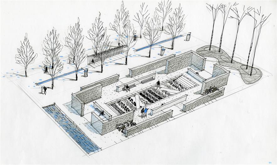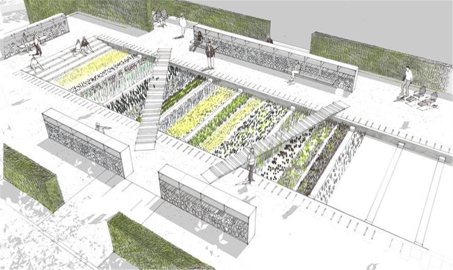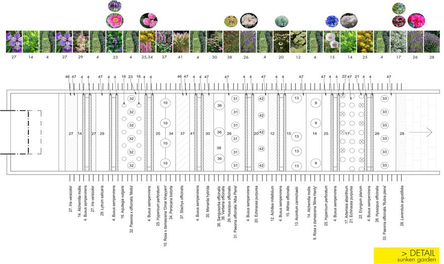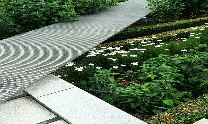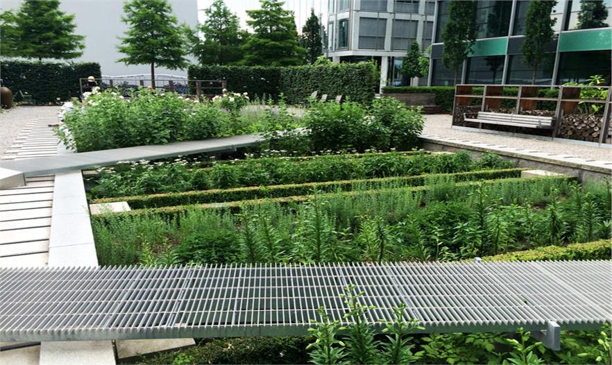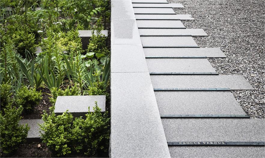 因此,諾華草藥園不僅隱秘,空間結構還像是一個劇院,或是一個迷宮,或是一個有許多層的洋蔥。該花園是半封閉的,游客只能從紅豆杉(紫衫)和山毛櫸之間的曲折小道進入,草藥園將會是一層一層的揭開其真面目。人們在這里看到的研究人員和當時中世紀僧侶做的都是相關的事情。來到花園中心,有一塊開放式的下沉式植床,這里面按順序種植著31種藥用植物。另外在一片由花崗巖石框架圍護的地塊中種植了珍貴的植物,這些脆弱的的標本是不能觸碰的。只能從高處來觀察,我們可以通過色彩和紋理以及條狀結構上來了解這個花壇。我們在其上面建造了輕型橋梁結構,沒有欄桿,橫跨在凹床上,允許讓膽大的游客近距離觀察植物,其中在每塊植床的邊緣都安裝了一塊青銅牌標簽。