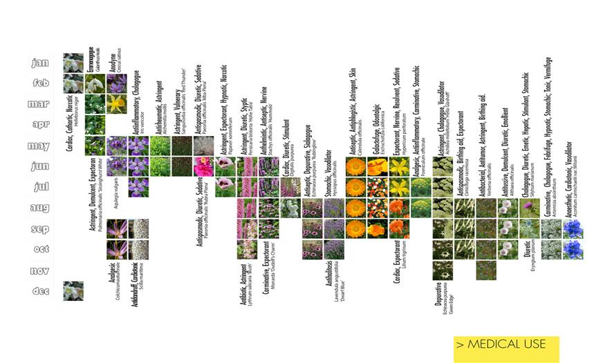 在草藥園的兩側設有四個“日志架”,這里堆放著采集來的原木樹樁,就好像是圖書館的書架。這些木材的類型選擇了可以代表能夠提取藥物的樹種??偠灾@里共有70種植物供人欣賞。