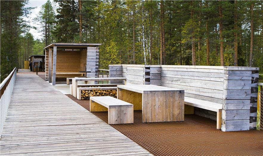 之后還會(huì)設(shè)計(jì)裝置、野餐屋、觀測(cè)塔、標(biāo)識(shí)、廁所、燒烤、廢物處理機(jī)以及觀景臺(tái)。使用的材料是切割好的木材,鳩尾接合,比普通、堅(jiān)固木板還要狹窄的栓木以及混凝土和耐候鋼鐵光柵。