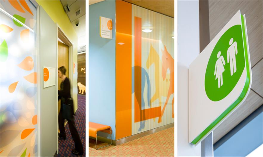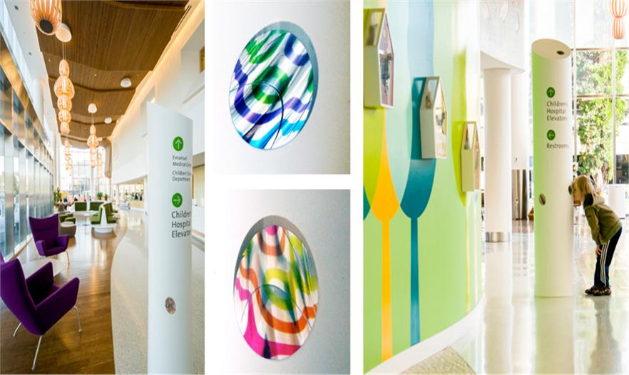 蘭德爾兒童醫(yī)院由Mayer/Reed事務(wù)所與ZGF Architects事務(wù)所的室內(nèi)設(shè)計團(tuán)隊(主攻主題畫、圖形和顏色配置)合作完成?;诤⒆訉ψ匀皇澜缰袌D像喜愛的研究,該事務(wù)所使用啟發(fā)思維的顏色配置、圖形和圖畫來突出俄勒岡和華盛頓區(qū)(此醫(yī)院要服務(wù)的地區(qū))的地理多樣性。每層都會有一個動物,利用各種材料重復(fù)設(shè)計這個動物,而且會在意想不到的地方出現(xiàn)。