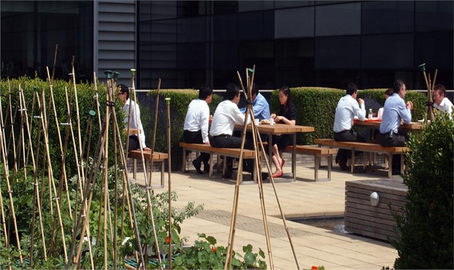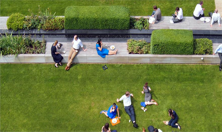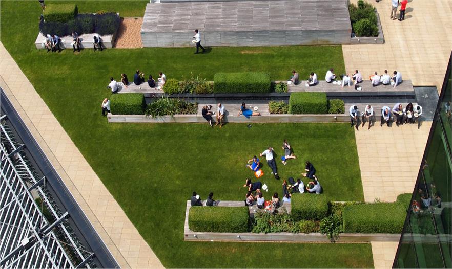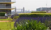 該建筑有2個(gè)陽臺(tái),分別是2500平方米以及500平方米。設(shè)計(jì)師對(duì)此進(jìn)行巧妙的設(shè)計(jì),最大化觀賞泰晤士河上的景象。最大的一個(gè)花園包括2個(gè)線性水道,設(shè)有水池和小瀑布,構(gòu)成主要的景觀特色。伊羅科木用于建造花盆和座位元素,種植多年生植物、設(shè)置常綠綠籬,為全年增添色彩。約克石鋪裝路面提供休閑和活動(dòng)空間,同時(shí)草坪可用于夏季使用。一部分露臺(tái)讓工作人員種植自己的植物和食物,在不能進(jìn)入的屋頂區(qū)域設(shè)置蜂房。