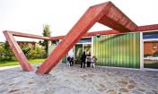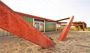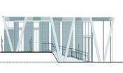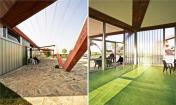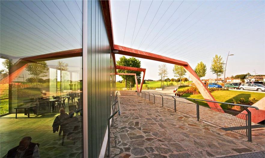 這是位于意大利的一個老年人中心,屬于羅馬市區(qū)重建計劃的重要組成部分,這個計劃還包括當(dāng)?shù)氐囊粋€社區(qū)中心和一個配備體育設(shè)施的公園。建筑師希望建立一個開放的建筑,內(nèi)外空間不分彼此,建立建筑與大自然的對話。主要采取混凝土結(jié)構(gòu),交錯的柱梁定義了空間感。玻璃是聯(lián)系內(nèi)外的窗口。采用如此造型的結(jié)構(gòu)師希望展現(xiàn)最純粹的形式。同時采用低廉的造價實現(xiàn)這一切。三對梁(截面800乘以280)在空中交錯,形成鮮明的特點,同時在門廊上方,依著梁拉起鐵絲網(wǎng),以便植物攀援上去。梁于屋頂準確碰合。這些梁的材料是混凝土,上面涂上彩色顏料。混凝土斜梁采取現(xiàn)場澆注的方法一次性完成,因此在澆注的過程中相當(dāng)仔細和謹慎。