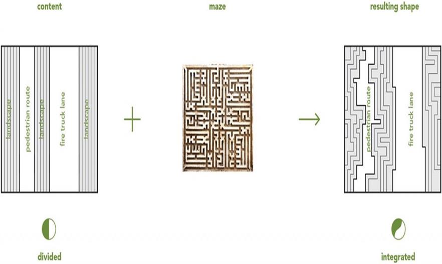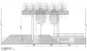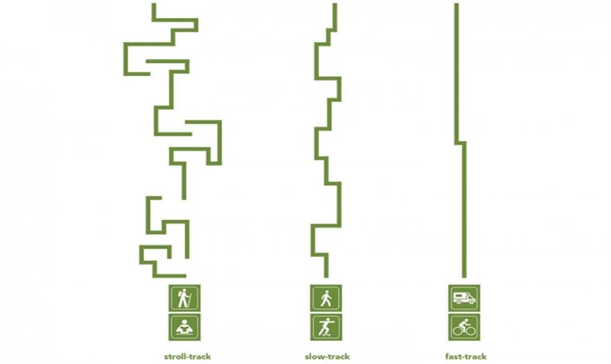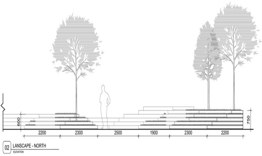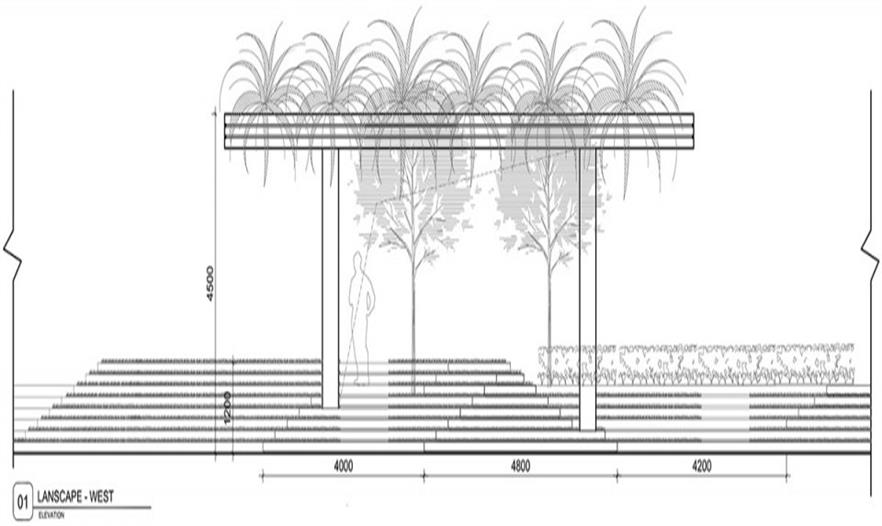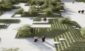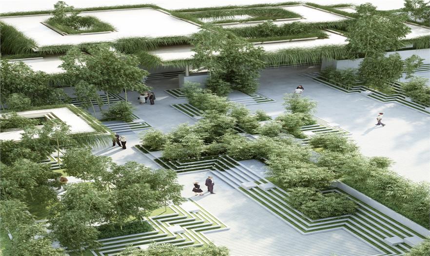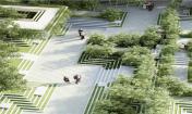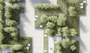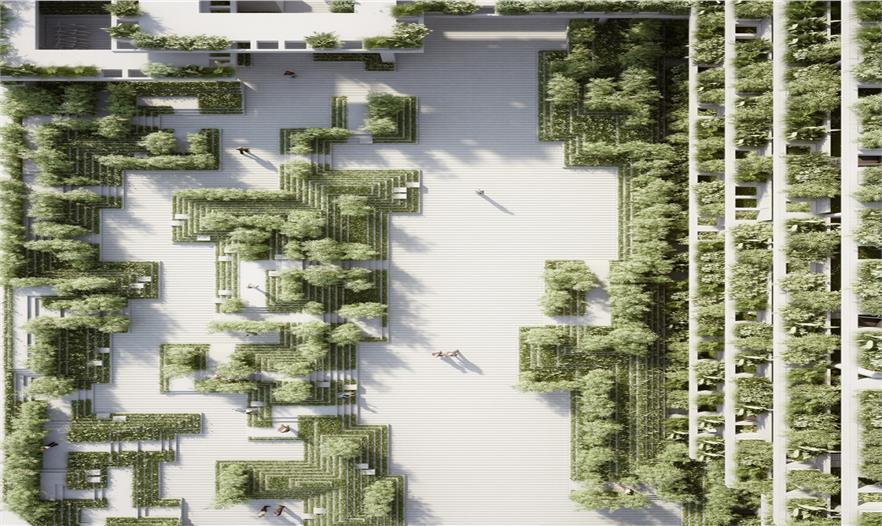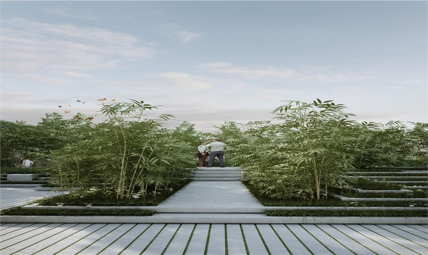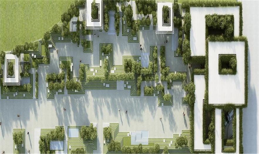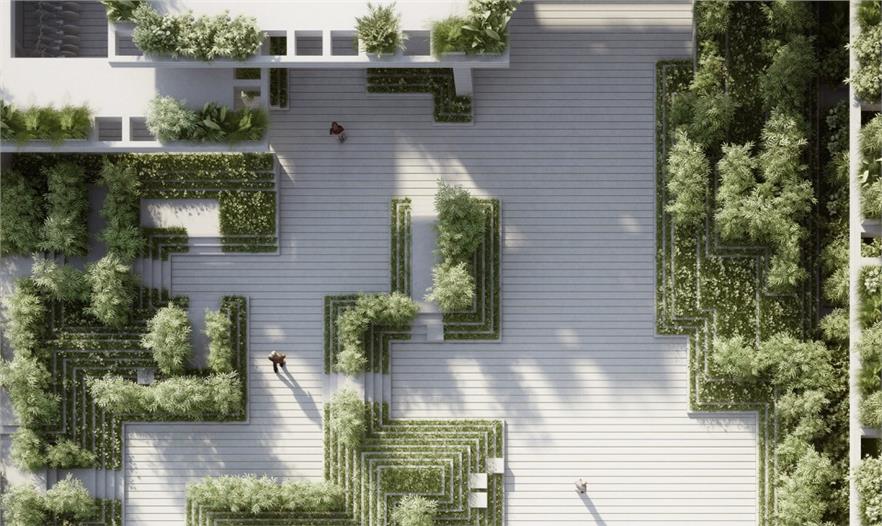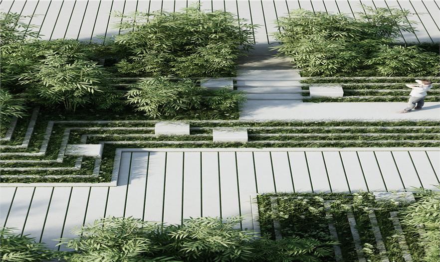 Penda將印度的樓梯井視作靈感來(lái)源,在景觀中打造了臺(tái)階。這些臺(tái)階可以用來(lái)當(dāng)作綠植空間,種滿(mǎn)鮮花、香 草和草坪,成為居民共用的花園。考慮到印度的水迷宮,我們對(duì)臺(tái)階進(jìn)行了調(diào)整,以營(yíng)造不同的背景氛圍: 從有公園漫步般享受的私家花園、到可以進(jìn)行大型集會(huì)的開(kāi)放式廣場(chǎng)。這一面積8000平方米的大型景觀圍繞 三種不同的行人流動(dòng)速度進(jìn)行設(shè)計(jì)。一條寬闊筆直的大路,供跑步的人以及快步行走的人使用,同時(shí)可以讓 消防卡車(chē)用作應(yīng)急通道。希望盡快到達(dá)自己的公寓,同時(shí)又想在在公園里更私密的背景下進(jìn)行散步的居民, 可以使用第二條較窄一些的步道。第三條小徑通過(guò)臺(tái)將人們引向更加私密的花園,主要用于在傍晚通過(guò)這一景觀散步或者遛狗;這條小徑將行人引入竹林山坡、花園和水景,并建造了用于行人休憩的長(zhǎng)椅。這一景觀將服務(wù)145棟公寓的居民,并將于2016年夏季開(kāi)始施工。