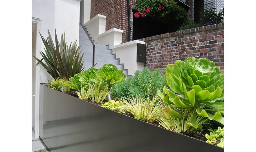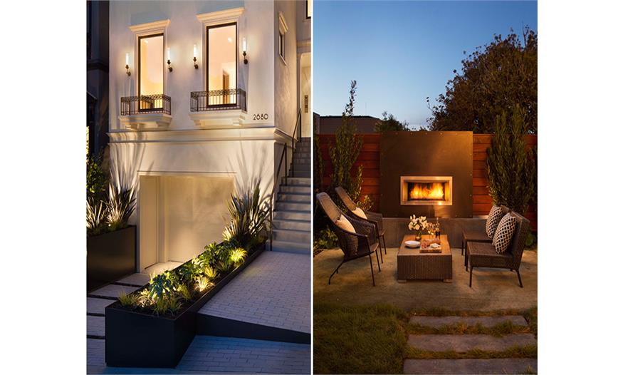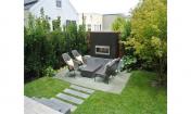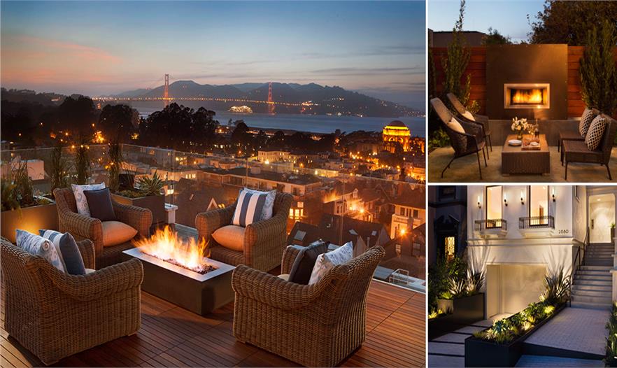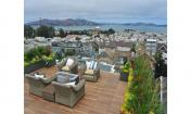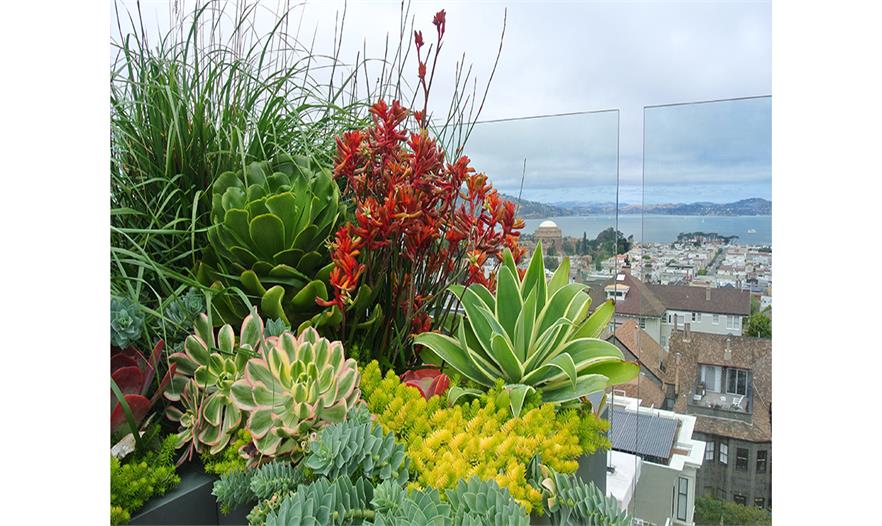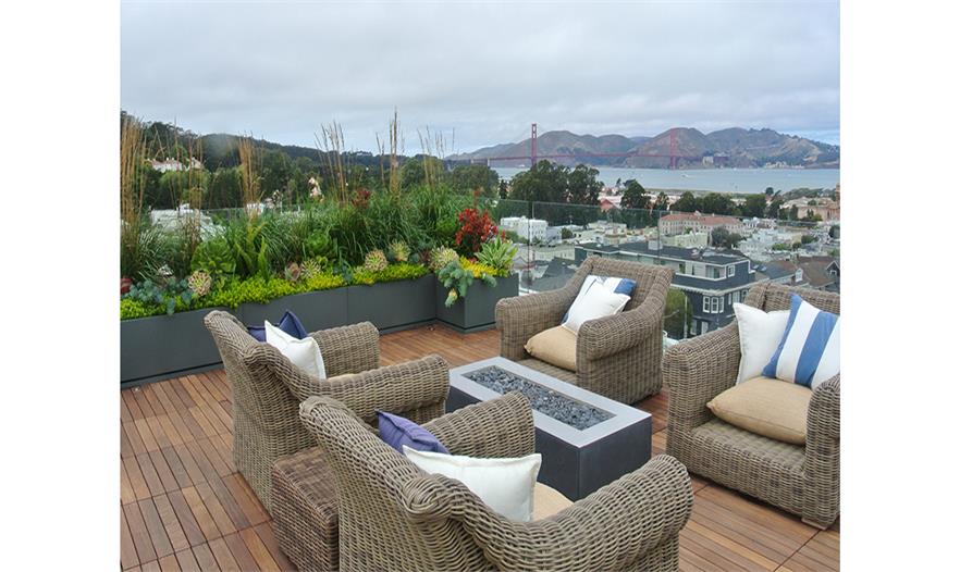 人們從石頭庭院中走出來(lái)會(huì)進(jìn)入到這個(gè)舊金山花園的陰涼區(qū),將室內(nèi)外生活空間融合起來(lái)。翠綠的草坪中設(shè)有混凝土臺(tái)階和鋪裝路面,直達(dá)壁爐旁邊的座位區(qū)。該房屋的屋頂露臺(tái)是木制鋪裝地板,整個(gè)漂浮在空中。玻璃防護(hù)墻讓人們感覺該空間是開闊、明朗的——當(dāng)你被繁盛的植被環(huán)繞時(shí)它就會(huì)從景色中消失。植被花盆營(yíng)造出這個(gè)繁茂的屋頂花園,設(shè)置觀景視角,增強(qiáng)隱私性。