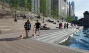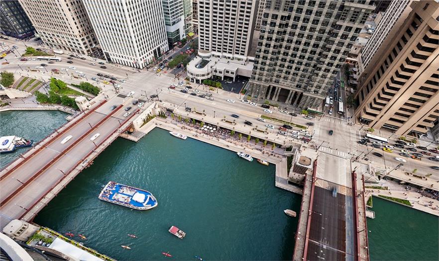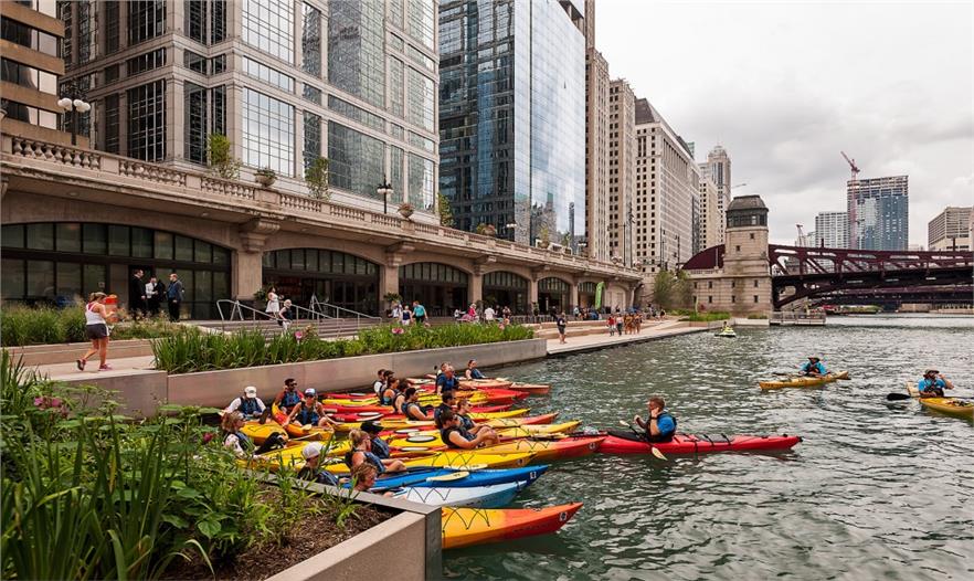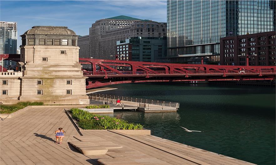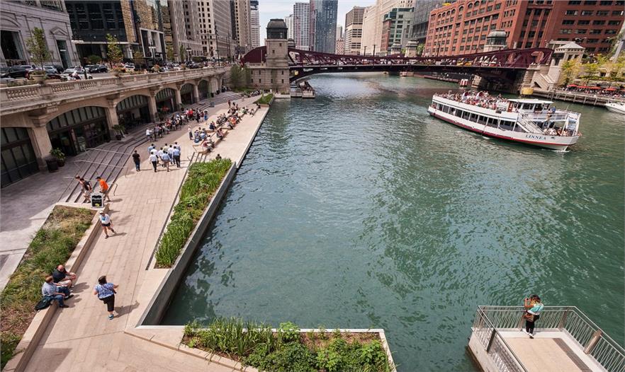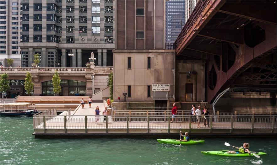 芝加哥河主干有著悠久且豐富的歷史,它在很多方面呈現(xiàn)了芝加哥城市本身的發(fā)展。芝加哥河以前是一條蜿蜒的沼澤,后來被硬化改造為工程河道以支持城市向工業(yè)型轉(zhuǎn)換。為了改善衛(wèi)生情況,城市將河流主干與南邊分支水流方向倒轉(zhuǎn),在此之后,建筑師與城市設(shè)計師丹尼爾·伯納姆提出了濱河步道與瓦克道高架橋的新愿景。近十年來,河流所扮演的角色隨著芝加哥濱河項目再次轉(zhuǎn)換——重拾芝加哥河的城市生態(tài)與休閑效益。幾年前,由于河流的重度污染,濱河休閑是遙不可及的目標。但今天這個愿景成為現(xiàn)實。在水質(zhì)方面的最新進展以及沿河公共休閑使用強度的提升都體現(xiàn)了濱河生活的增加,呼喚通向水岸的新的連接。響應這些號召,芝加哥交通部開始實施濱河步道項目,用新空間充實系統(tǒng)的各個部分,其中包括非常成功的退伍軍人紀念廣場與沃巴什廣場。