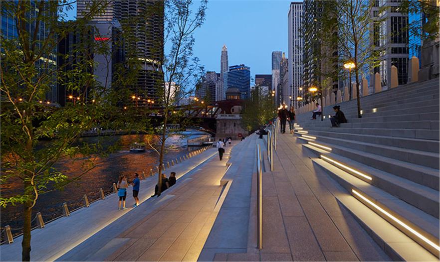 2012年,Sasaki、羅斯巴尼建筑事務所、阿爾弗雷德本納什工程公司以及廣泛的技術(shù)顧問團隊合作,任務是為州街與湖街之間的六個街區(qū)創(chuàng)造愿景。在先前河流研究的基礎(chǔ)上,此團隊提出的芝加哥濱河概念規(guī)劃在湖泊與城市步行系統(tǒng),以及河流在城市中的支流之間提供了最后的關(guān)鍵連接。但此任務在技術(shù)上面臨極大挑戰(zhàn)。設(shè)計團隊需要在局限的7.6米寬的建成區(qū)擴展步行項目空間并與街區(qū)間一系列穿過橋下的區(qū)域協(xié)調(diào)。除此之外,設(shè)計還需要適應河流每年的洪水漲落,豎向高度差近兩米。