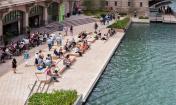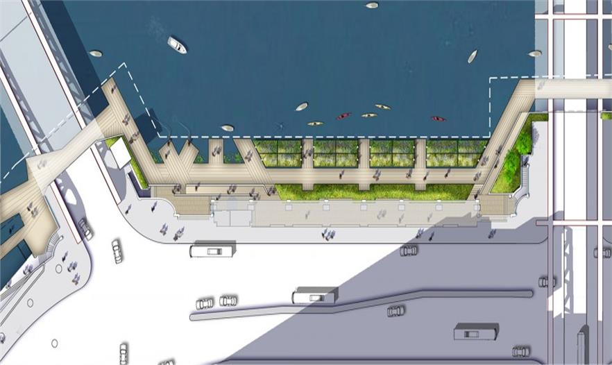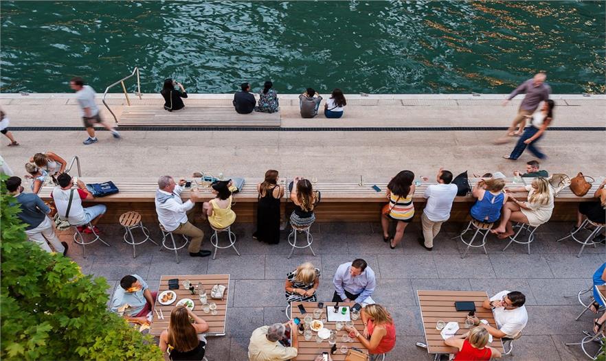 碼頭廣場:餐廳與露天座椅使人們可以觀賞河流上動態(tài)場景,包括駁船航行、消防部門巡邏、水上的士和觀光船。