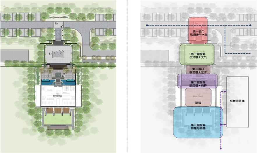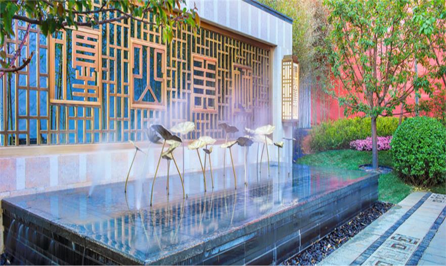 通過(guò)鏡面假山和陣列拴馬樁塑造外庭的尊貴儀式感,借由“竹境夾道”將客戶引流至深園。