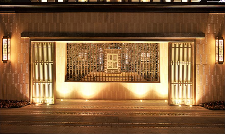 穿過(guò)框景格柵轉(zhuǎn)進(jìn)第二進(jìn)庭院,銅質(zhì)宮燈營(yíng)造迎賓序列;LOGO銅板鑲嵌的地面與陽(yáng)光下斑駁的竹影交輝,猶如筆意生動(dòng)的留白水墨。