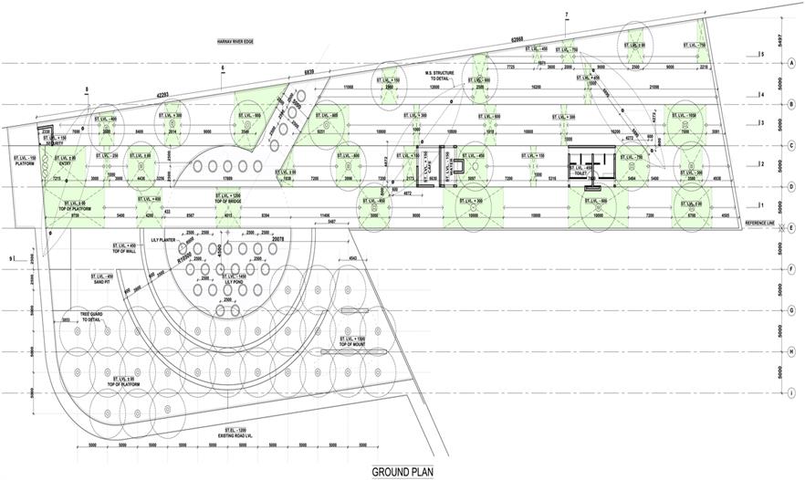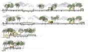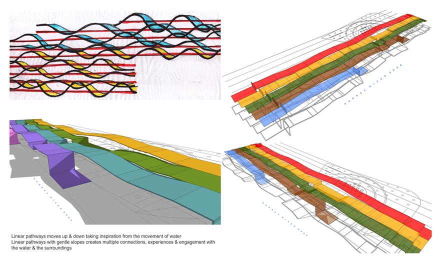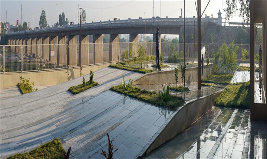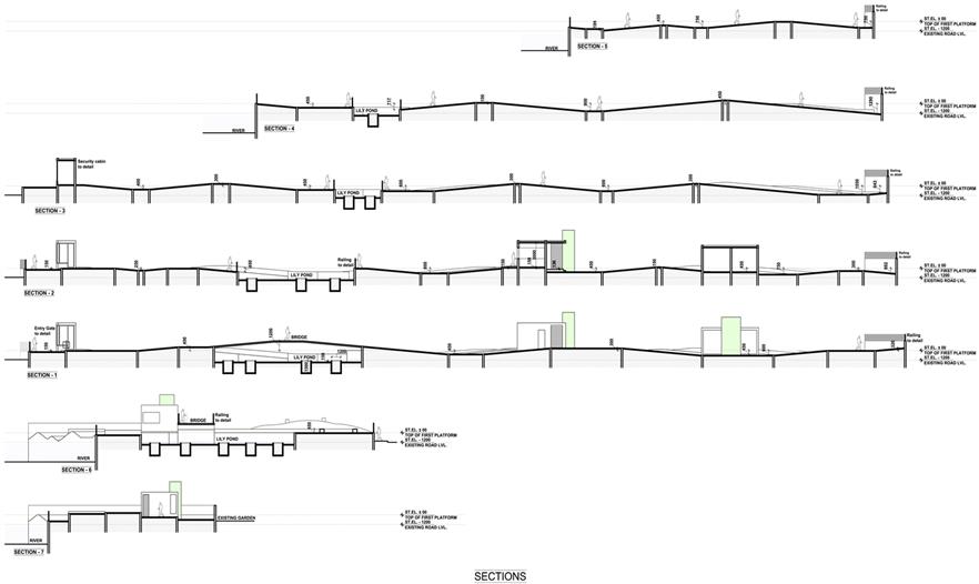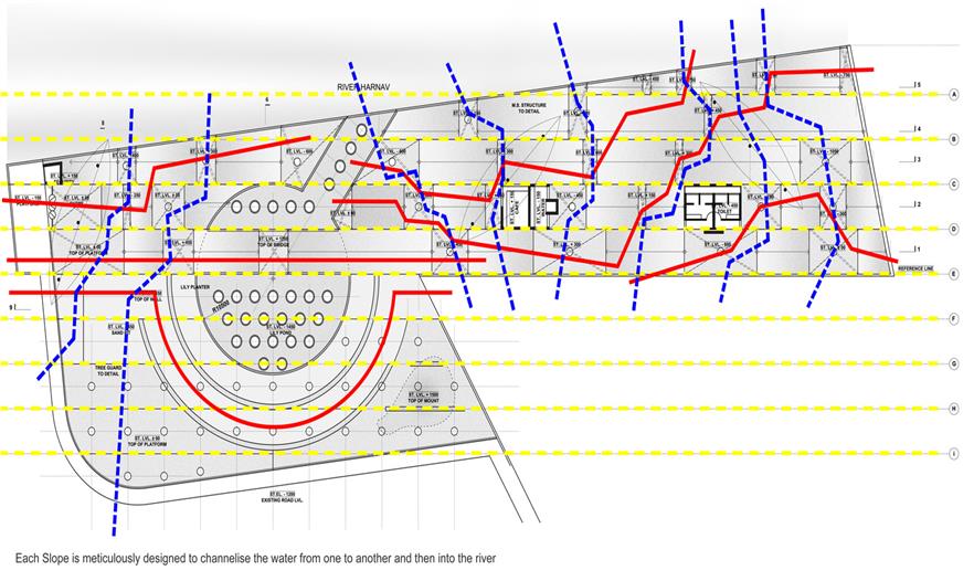 當一個人沿著這線性道路連續(xù)移動時,和周圍環(huán)境的感受和互動一直在改變。這些路徑的上下移動建立了新的程序化的連接。在某些地方它是沿著道路的邊緣步行道,隨著它向下移動它轉(zhuǎn)變成高度較低的座椅。當改路徑再次向上移動,它將沿著蓮花池形成一座橋,同時相同的路徑變平作為自助餐廳前的休憩。這個線性連續(xù)運動通過創(chuàng)建多樣的游客體驗供游客享受。這些豐富多樣的體驗讓所有年齡組的大人和兒童都能有機會享受河岸帶來的樂趣。在河岸上有座椅和種植提供綠化和遮蔭。當人們在這個地方休閑地散步時,可以收獲類似于在水中運動的感受。每條通道的斜率都通過精心設(shè)計,流水通過管道從一個通道通向另一個最終入河。游客從斜坡路到達平地時可自主改變行走的路線,每條路都提供排水通道。