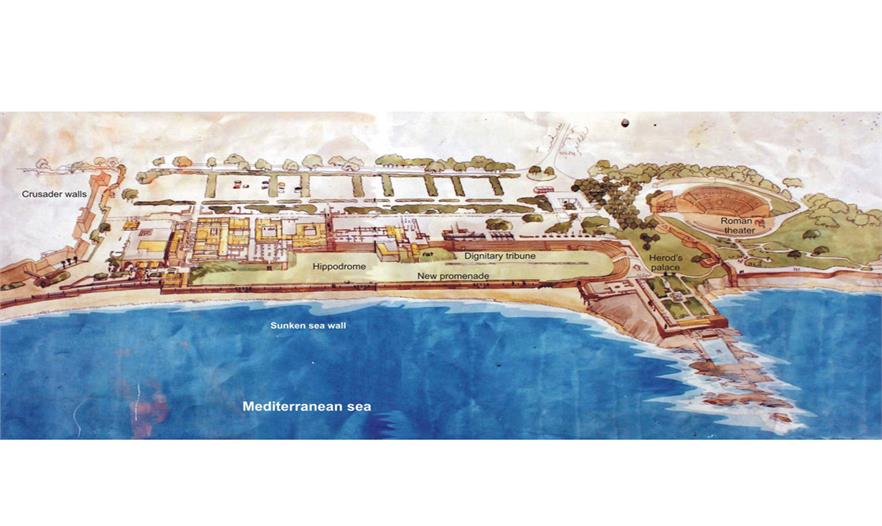 凱撒利亞由大希律王建于公元前30年,是地中海東部一個(gè)主要的羅馬城鎮(zhèn)。1101年被十字軍占領(lǐng),等十字軍滅亡后,該城鎮(zhèn)也淪為廢墟。20世紀(jì)60年代,考古學(xué)家挖掘出十字軍時(shí)期的一個(gè)羅馬劇場(chǎng)和古老的城墻,但這個(gè)101公頃(250英畝)的區(qū)域現(xiàn)在只是被探索出一部分。最令人震驚的是從沙丘中修復(fù)出來(lái)的一個(gè)大型競(jìng)技場(chǎng),在公元80年由弗拉維奧•約瑟夫斯描繪過(guò)。由于海洋已經(jīng)摧毀了競(jìng)技場(chǎng)的西部墻面,人們決定在一條散步道頂上建造一個(gè)防浪堤,填補(bǔ)出遺失的一邊墻壁,讓人們看到古代建筑的規(guī)模和魅力,同時(shí)讓人們?cè)趶U墟中以及地中海邊緣能夠愉快地散步。該規(guī)劃也包括步行道、老城、考古花園和停車(chē)場(chǎng)的建造。