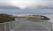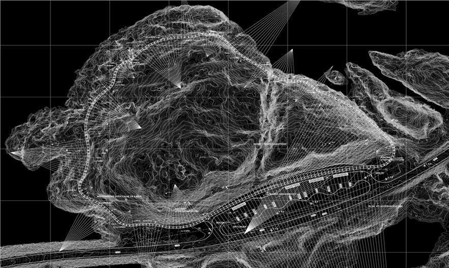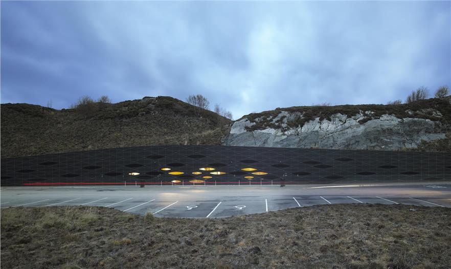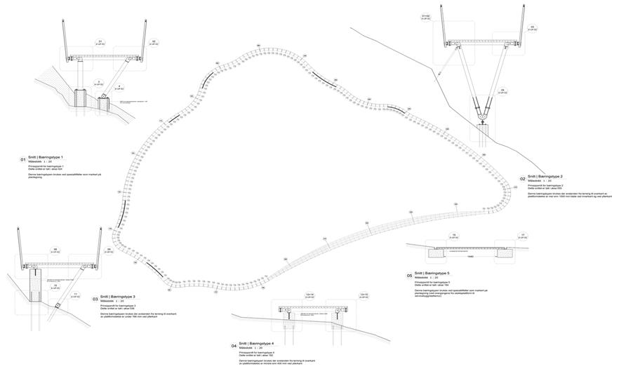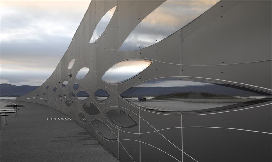 我們獲勝的項(xiàng)目整合了平臺(tái),停車場(chǎng)和服務(wù)樓,使之變成了一個(gè)基礎(chǔ)設(shè)施單體。700米的步道是由197根鋼框架和196個(gè)集成的可滲透格柵組成,這種做法由于允許風(fēng)雨和光線的濾過而保護(hù)了當(dāng)?shù)刂参?,提供了一個(gè)不打滑的步行表面。這里為步行的游客提供一次溫和的步行休憩,在欣賞島的全景的同時(shí)又可以坐下靜思。該平臺(tái)的產(chǎn)生始于一個(gè)基于場(chǎng)地的邏輯,以緊密而流暢地順應(yīng)這里的地形條件;通過不同半徑界定的路徑抬升,下沉和轉(zhuǎn)折在平面與立面上出現(xiàn)??蚣芄こ贪ㄒ粋€(gè)節(jié)點(diǎn)可調(diào)的不銹鋼零件,它的目的是為避免在現(xiàn)場(chǎng)切割和焊接結(jié)構(gòu)部件,以降低腐蝕風(fēng)險(xiǎn)。服務(wù)樓包含一個(gè)咖啡館,幾間休息室和旅游信息。它隱藏在150m長擋土墻的路徑下,其開窗與裝飾紋理都抽象地呼應(yīng)了鯡魚群。