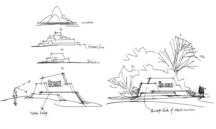 入口:主入口的一面是幾何形體石砌景墻,拼貼的規(guī)格各不相同?,F(xiàn)場由山水比德園林集團(tuán)旗下的怡人工程完成了每個不同標(biāo)號的石塊的內(nèi)外切面工藝,并嚴(yán)絲合縫的組裝、堆疊,成為了這項工程令人驚喜的地方之一。