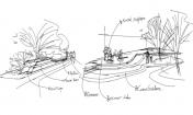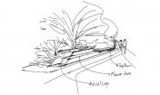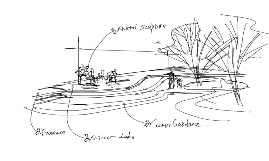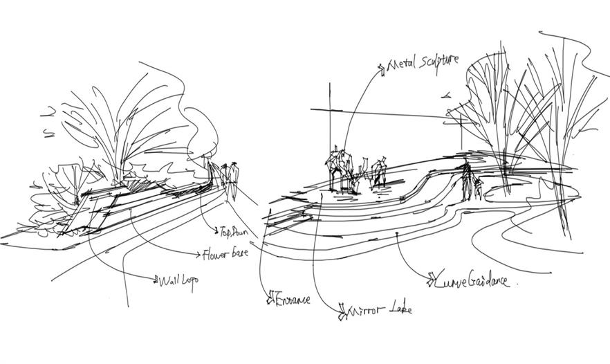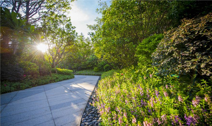 花林夾道:茂密的花林造就了幽深的境界,具有強(qiáng)烈的導(dǎo)向性。沿途采用了流線型的鋪磚,再次體現(xiàn)了流動的自然?;謯A道的做法頗費(fèi)心機(jī),沒有采用常見的點陣種法,而是利用叢植使花林在分布上更接近自然生長狀態(tài),無論在選苗還是種植上,都更增加了施工的難度。