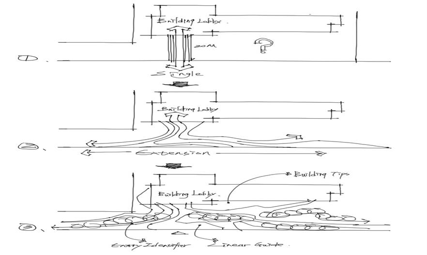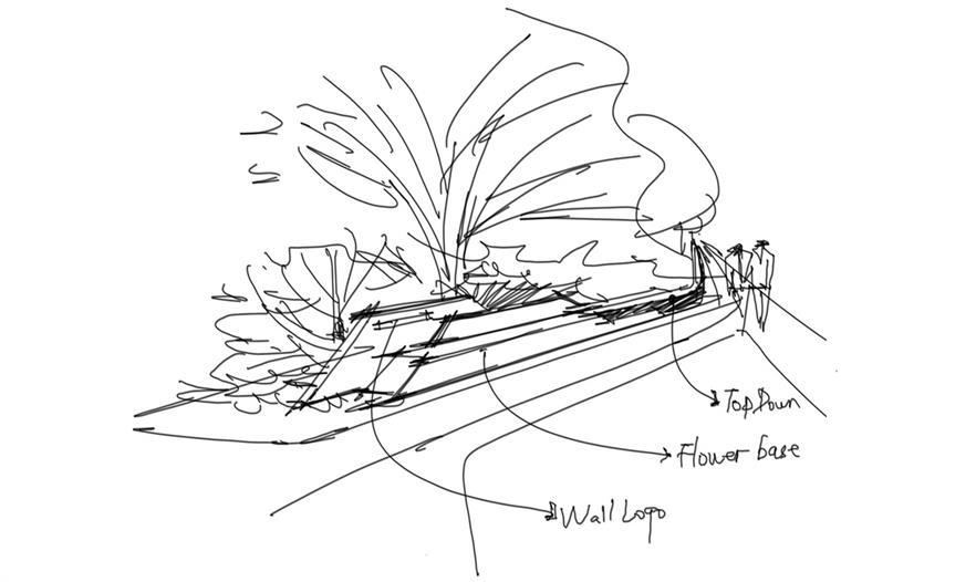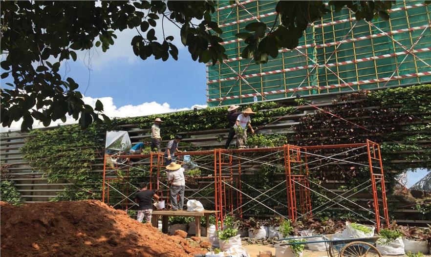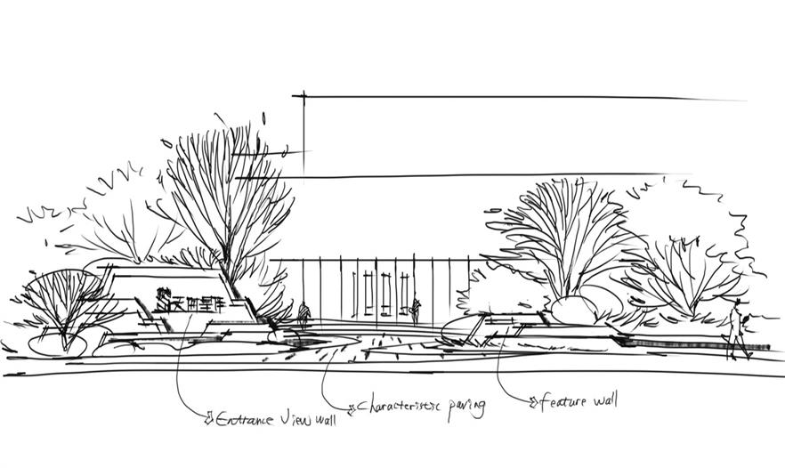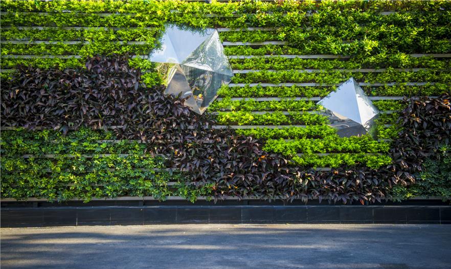 綠墻:設(shè)計揚(yáng)其繁華之長,避展其被原外部雜亂圍蔽遮擋之短,以簡約線性的設(shè)計手法進(jìn)行橫向立面的延展,實現(xiàn)視線的通達(dá)性,在喧囂中打造引人入內(nèi)的開敞境內(nèi)。