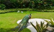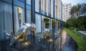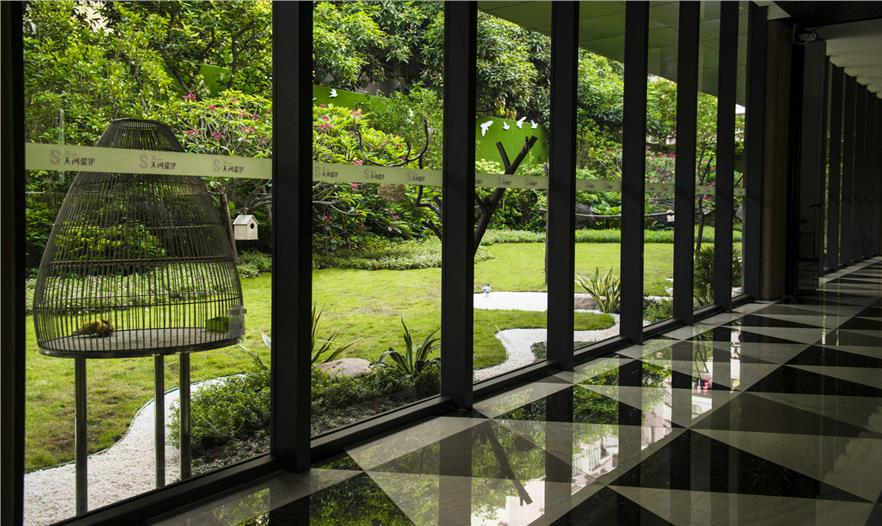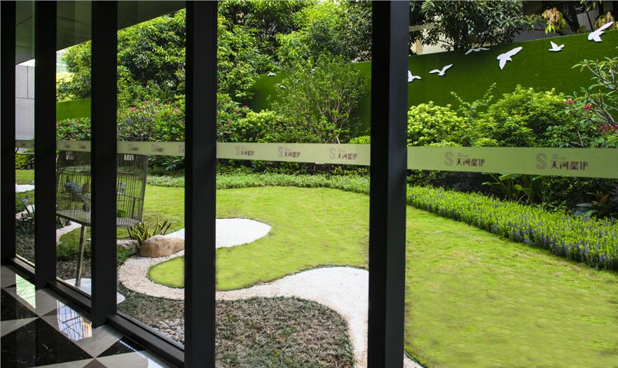 后場:線型的景觀草坪界定出后場的空間,營造出靜謐的售樓區(qū)氛圍。白鴿群鳥乘著綠意,展翅欲飛,生機(jī)勃勃的自然景象躍然墻上。