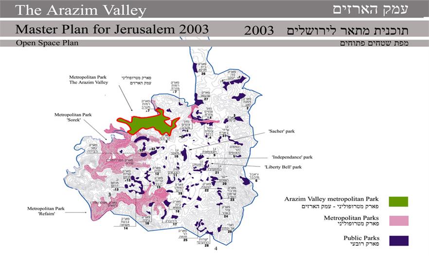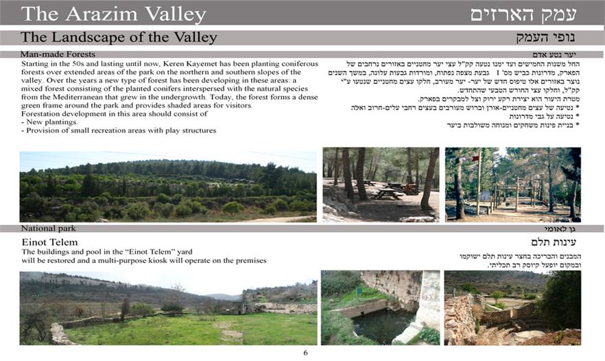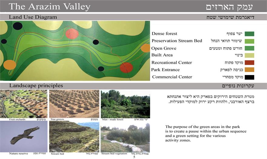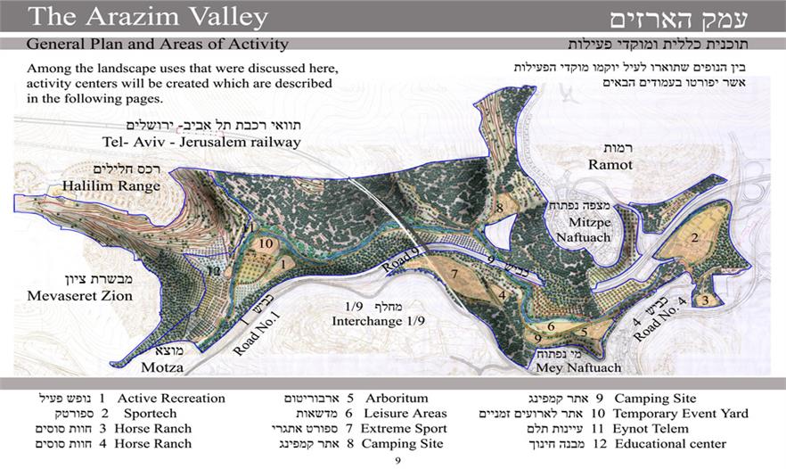 這個3000德南的公園是環(huán)繞耶路撒冷周邊一系列公園中的一個。其主體規(guī)劃方案要保護現(xiàn)有的大部分區(qū)域,包括自然資產(chǎn)和文化區(qū)。這里依然有多樣化的動植物,還有種植的和天然的森林、開放的草地、傳統(tǒng)的文化梯田和田地、以果樹林呈現(xiàn)的現(xiàn)代農(nóng)業(yè)、考古區(qū)和地質(zhì)構(gòu)造、橫穿公園的季節(jié)性河床以及現(xiàn)有國家公園的其他部分。該方案確定了該公園中央線的幾個位置,讓游客可在特定的區(qū)域內(nèi)開展休閑活動。該公園也是耶路撒冷主要基礎(chǔ)設(shè)施廊道中的一個。將這些設(shè)計成功地融入公園里是該公園和道路系統(tǒng)設(shè)計中一大難題。