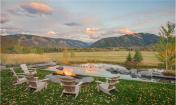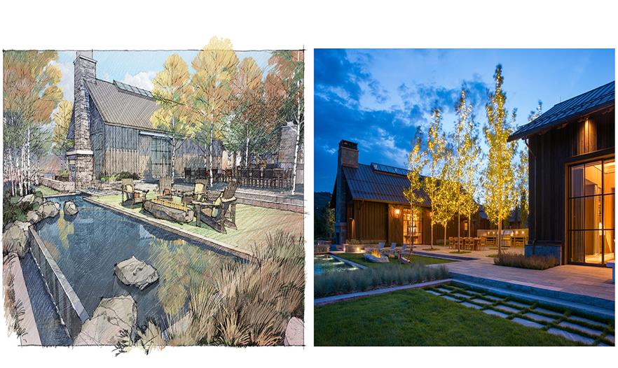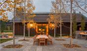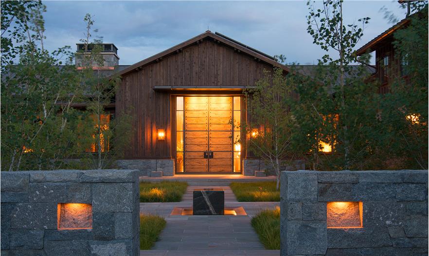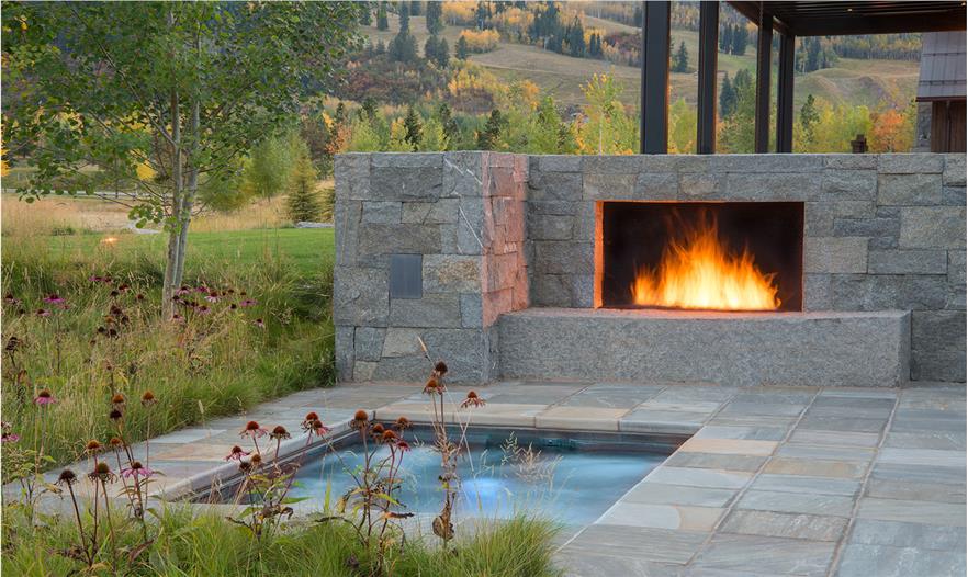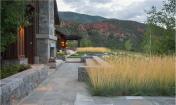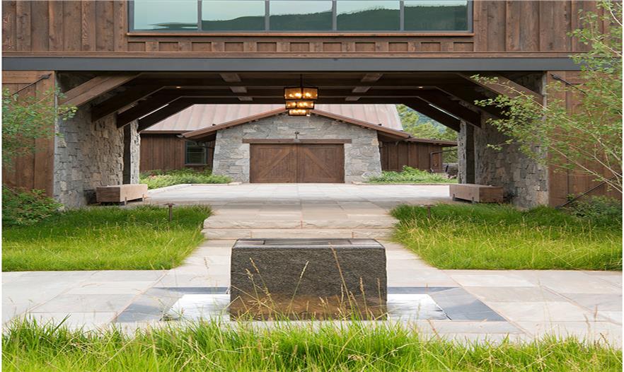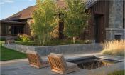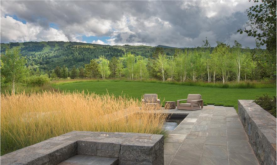 這個(gè)設(shè)計(jì)團(tuán)隊(duì)并沒(méi)有利用下面的規(guī)劃原則——在結(jié)構(gòu)之間建造護(hù)堤以及種植濃密的松柏植物,而是將該空間利用成該住宅主要的聚集空間。其設(shè)計(jì)結(jié)果就是一個(gè)統(tǒng)一的布置,抹去任何潛在的界限概念。盡管要設(shè)計(jì)容納大群朋友和家人,該庭院依然要維持廣闊環(huán)境內(nèi)的親密感。該家庭的餐桌位于主建筑軸線上以及大片白楊林斑駁的樹(shù)冠下面,成為了一個(gè)裝飾物。在北面,緊密種植的干草(歷史農(nóng)場(chǎng)中熟悉的元素)保護(hù)房屋不受嚴(yán)酷西風(fēng)的侵蝕,在建筑和公路旅舍之間建造植物屏障。南面,裂縫的石頭樓梯向下延伸到草坪的直線部分,之后就是雕刻的花崗巖壁爐。一個(gè)淺淺、無(wú)邊際的浸泡池映射出山脈、天空的全景。一個(gè)設(shè)計(jì)好的花崗巖陡坡提供了一個(gè)非正式的座位平臺(tái)。