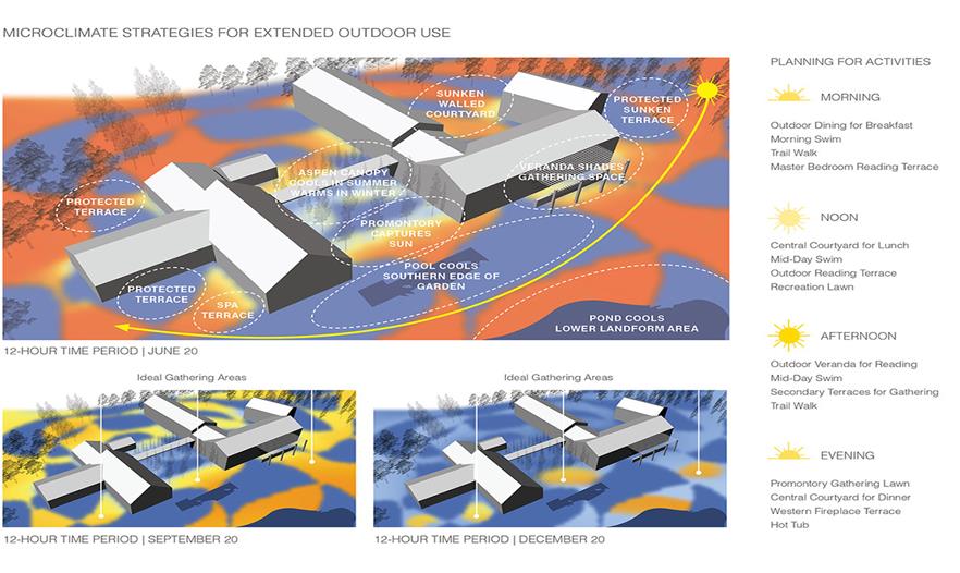 除了其退化的條件,該地產(chǎn)占有豐富的水資源,如灌溉水渠,勾勒出農(nóng)業(yè)草甸的邊緣。這個(gè)資源讓景觀設(shè)計(jì)師能夠技巧性的、有責(zé)任感地將水綜合成一種美學(xué)、生態(tài)和功能元素。屋頂和臺(tái)地雨水徑流被捕獲,流入植被區(qū),這樣區(qū)域徑流就會(huì)呈現(xiàn)零增長(zhǎng)。植被也基于水需求分區(qū)種植,但在建成之后一些植物很少需要灌溉。