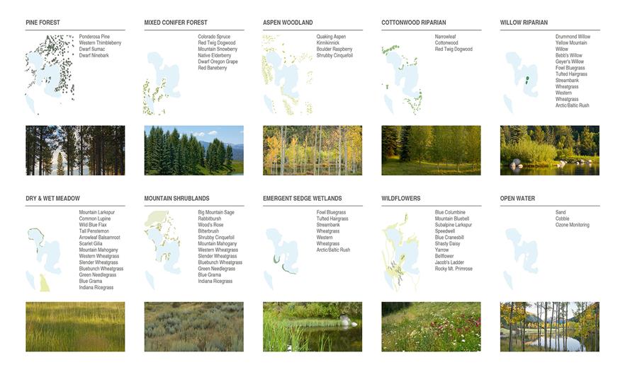 被遺棄、光禿禿和野草蔓生的地產(chǎn)修復(fù)從分析周圍環(huán)境條件開始,包括主要植被區(qū)、物種組成和密度、小氣候的詳細(xì)研究,為該地產(chǎn)的整體設(shè)計(jì)做參考。整個(gè)區(qū)域分析顯示出極端氣候變化,如強(qiáng)烈的太陽照射、盛行風(fēng)、溫度變化以及10月到次年4月的雪季覆蓋。另外,區(qū)域山地植物區(qū)研究建議重新引入10個(gè)不同植被類型,如松樹林、混合松柏林、山楊林、濱河三角楊、河岸垂柳、干草地、濕草甸、蘆葦濕地、山地灌木林、野生花和開闊水面。