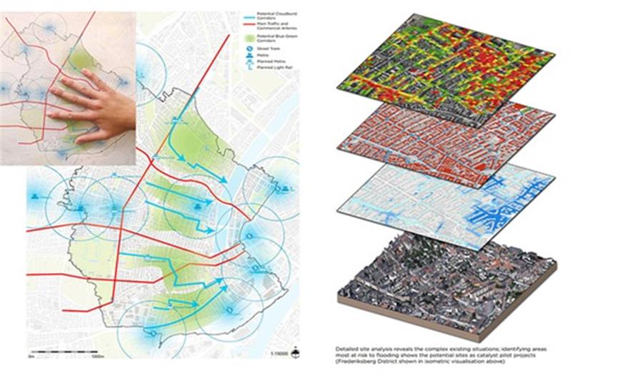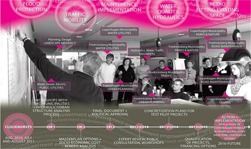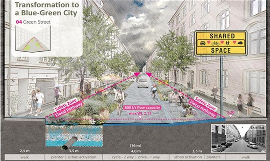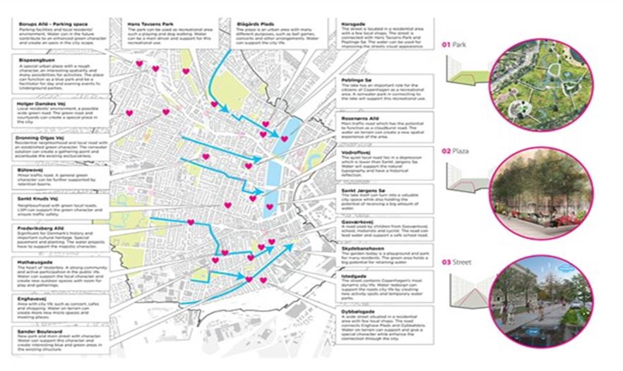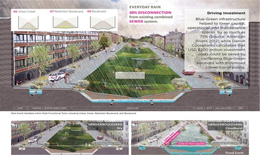 哥本哈根暴雨管理模式提供了一個將建筑、現(xiàn)有背景與藍綠色改造方案結(jié)合起來的結(jié)構(gòu)??蓪嵤?、實用的工具可以減少極端暴雨事件,改善我們的城市風(fēng)景。私人開發(fā)商和房主成為當?shù)胤桨傅膿碜o者,其中跨學(xué)科、跨部門的合作包括設(shè)計師、規(guī)劃師、社會學(xué)家、經(jīng)濟學(xué)家、生物學(xué)家、地理學(xué)家、信息專家和通信專家,并與公共事業(yè)公司、利益相關(guān)者、利益集團、當?shù)卣渭液屯顿Y者互動。