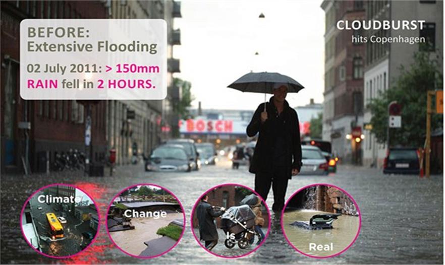 2011年7月2日,在不到兩個小時內(nèi),哥本哈根遭受了1000年一遇的極端風(fēng)暴天氣——或大暴雨——城市中大部分地區(qū)達到150毫米的降雨量,積水達到1米的高度。2011事件之后,2010年8月遭到了100年一遇的暴雨, 2014年再次遭到重創(chuàng)。哥本哈根當局意識到暴雨并不是一次偶然事件;由于氣候變化綜合效應(yīng),預(yù)計到2110哥本哈根港口的海平面將上升1米。在許多建筑物和服務(wù)設(shè)施位于城市地下且是聯(lián)合式管道系統(tǒng)的城市中,受污染的洪水將滲透到建筑和城市基礎(chǔ)設(shè)施中。