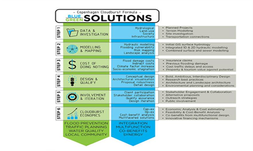 哥本哈根暴雨管理模式(Copenhagen Cloudburst Formula)是一個整合了藍綠色方法的6個步驟: