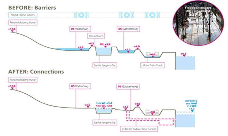兩個總體規(guī)劃方案上的變化用來評估潛在的優(yōu)點和缺點——選項1傳統(tǒng),選項2藍綠色。縱橫交錯的城市人造障礙(如街道、人行道、建筑物、或鐵軌)和最小的等級差異——防止洪水大量排向哥本哈根主要港口進入大海,兩個選擇之間的關(guān)鍵區(qū)別在于對Sankt J?rgens湖的發(fā)展策略。