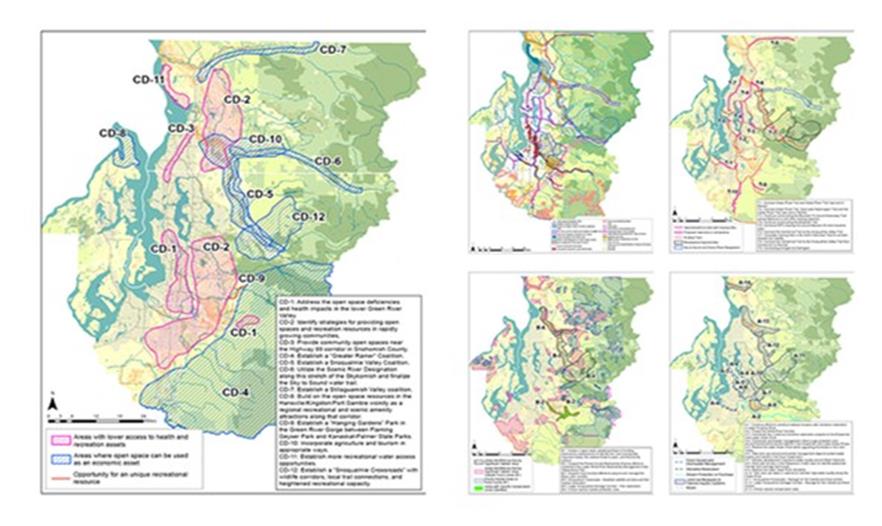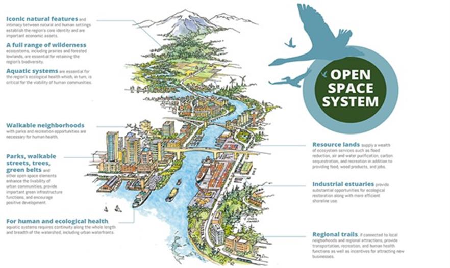 在過去的五年中, ROSS擁有一個(gè)包羅萬象的“開放空間”定義,將休閑空間和通道、健康生態(tài)系統(tǒng)、運(yùn)行景觀如農(nóng)場和森林、社區(qū)公園以及開放空間設(shè)施合并在一起。該項(xiàng)目以“初步的全面發(fā)展戰(zhàn)略”起步,讓100多個(gè)利益相關(guān)者來鑒定區(qū)域綠色基礎(chǔ)設(shè)施體系所預(yù)期的質(zhì)量,創(chuàng)建一個(gè)進(jìn)程路線圖建立這樣的系統(tǒng)。該方案建議與獨(dú)立河流流域(致力于普吉特海灣)規(guī)模上的社區(qū)合作,同時(shí)發(fā)展工具和程序,用來測量和強(qiáng)調(diào)區(qū)域聯(lián)系,將構(gòu)思和優(yōu)先考慮的舉措融入到整個(gè)區(qū)域。初步策略需要一個(gè)綜合性空間構(gòu)思,優(yōu)化開放空間效益,應(yīng)用景觀生態(tài)和生態(tài)系統(tǒng)服務(wù)概念引導(dǎo)決策,提升開放空間保護(hù)價(jià)值,從城市到鄉(xiāng)村到郊野中。