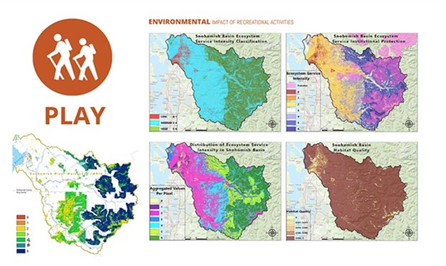 對于高密集的綠色杜瓦米許水域策略(Green-Duwamish Watershed Strategy),我們采用了一個(gè)專家參與程序,在“聽”的階段通過采訪、討論小組和開放日建立現(xiàn)有條件、創(chuàng)意和方案基準(zhǔn)。該項(xiàng)目的水域咨詢小組將水域策略的要點(diǎn)放到社會公平、連接開放空間的綜合性方法以及雨水規(guī)劃融合上。對于Snohomish WOSS,我們的員工繪制大量的GIS數(shù)據(jù),辨識出生態(tài)系統(tǒng)服務(wù)“熱點(diǎn)”,引導(dǎo)后來的規(guī)劃。然后我們與縣、州、市政和非營利規(guī)劃師合作,建造和評估空間情境,了解協(xié)作舉措和方案的多重效益。