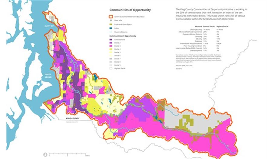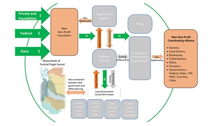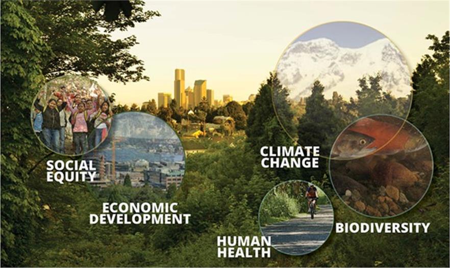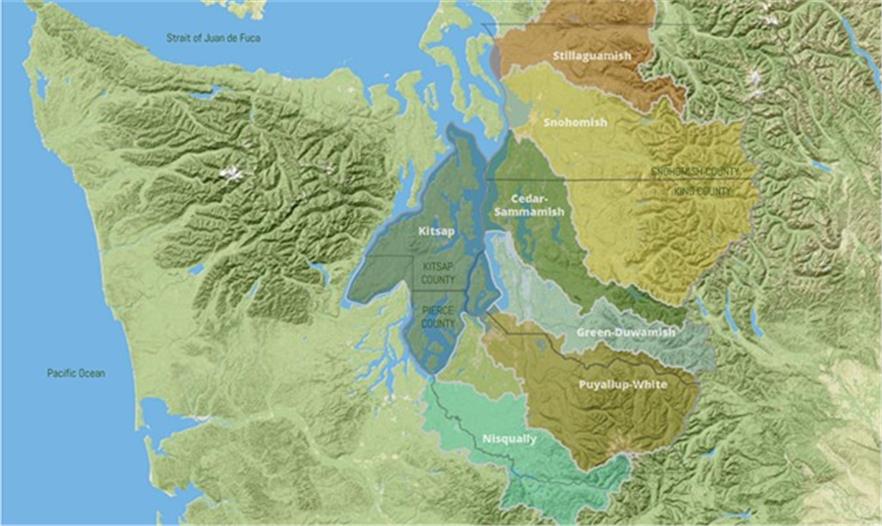 普吉特海灣中部地區(qū)是由八個(gè)主要流域和大西雅圖市區(qū)的四個(gè)縣構(gòu)成,從喀斯喀特山脈峰巒到普吉特海灣的海岸線。當(dāng)前和預(yù)期的人口增長預(yù)計(jì)將嚴(yán)重制約該地區(qū)的自然資源發(fā)展,威脅著定義該地區(qū)以及推動其經(jīng)濟(jì)增長和生活質(zhì)量的環(huán)境資產(chǎn)。雖然無數(shù)的努力旨在保護(hù)和修復(fù)普吉特海灣景觀和水域,政府和非營利組織一直未協(xié)調(diào)以及未提供足夠的資金有效地對抗這些挑戰(zhàn)。雖然該區(qū)域的景觀保護(hù)和加強(qiáng)能應(yīng)對這些問題進(jìn)行修復(fù),如氣候變化、生物多樣性缺失和健康公正,當(dāng)前經(jīng)濟(jì)和自然資源決策過程沒有展現(xiàn)自然資本的全部價(jià)值,導(dǎo)致開放空間投資不足。