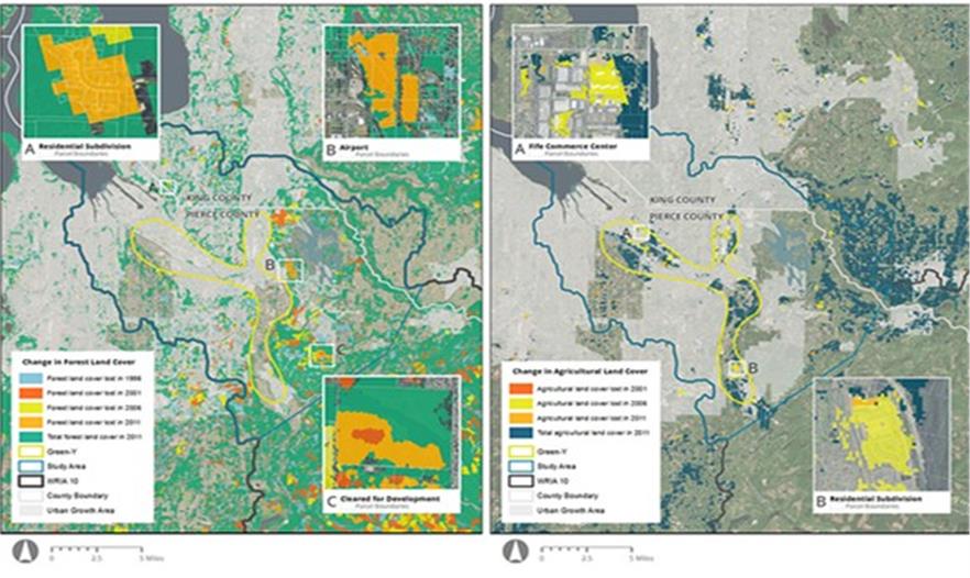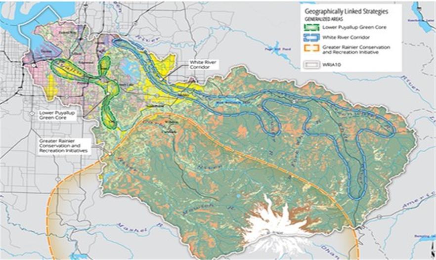 首先,Puyallup-White Watershed WOSS與當(dāng)?shù)氐摹袄婀餐w”合作,鑒定區(qū)域道路切斷、受威脅的農(nóng)田、定期洪水泛濫的區(qū)域、人口密集區(qū)開放空間“沙漠”和不受保護(hù)且生態(tài)最完整的區(qū)域。三大主要綜合性理念融合:“綠色Y”目標(biāo)區(qū)域具有多個(gè)效益,為服務(wù)不周到的社區(qū)提供耕地保護(hù)、道路連接、泛濫平原擴(kuò)張和開放空間的建造,目前該區(qū)域在農(nóng)業(yè)產(chǎn)品的經(jīng)濟(jì)貢獻(xiàn)每年約700萬美元;保護(hù)懷特河走廊,聚焦濱河增強(qiáng)工程;“Greater Rainier Coalition”改善保護(hù)和擴(kuò)張與休閑相關(guān)的經(jīng)濟(jì)活動。