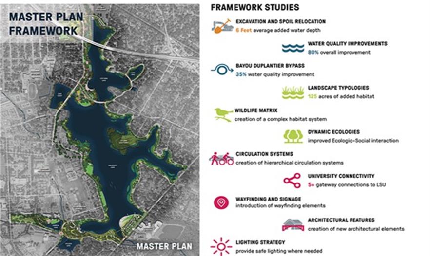 巴吞魯日河流總體規(guī)劃方案尋求在巴吞魯日中心建造一個強大、美觀的天然設(shè)施。該項目利用自然促進健康生活方式的建立同時為候鳥和水生動物提供棲息地基礎(chǔ)設(shè)施,將成為游客橫跨教區(qū)和整個州以新方式體驗路易斯安那州的區(qū)域。