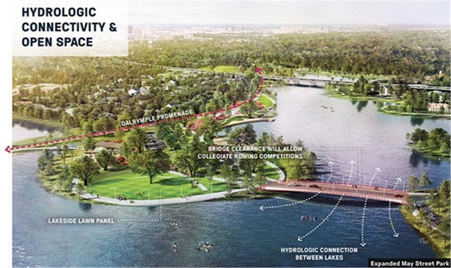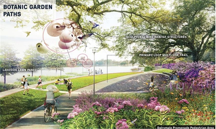 建造流通層次。8千米(5英里)的多功能步行道將建造在濱河填充地上,同時也會建造街道水平的自行車道。該湖泊東面的道路將轉(zhuǎn)換成單向道,在湖泊邊緣沿線提供安全的行人緩沖距離。