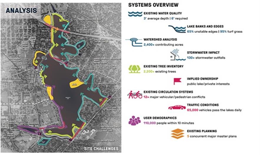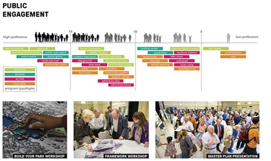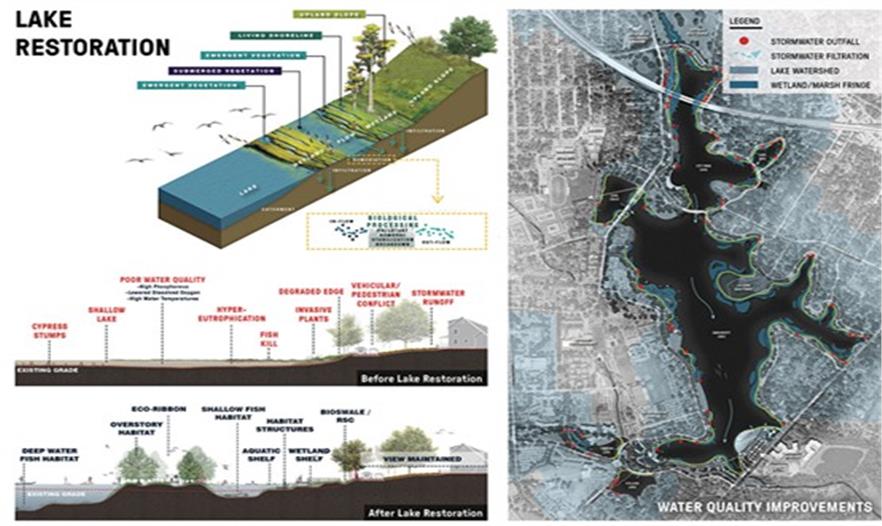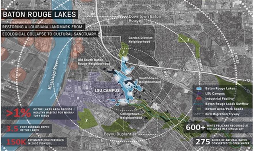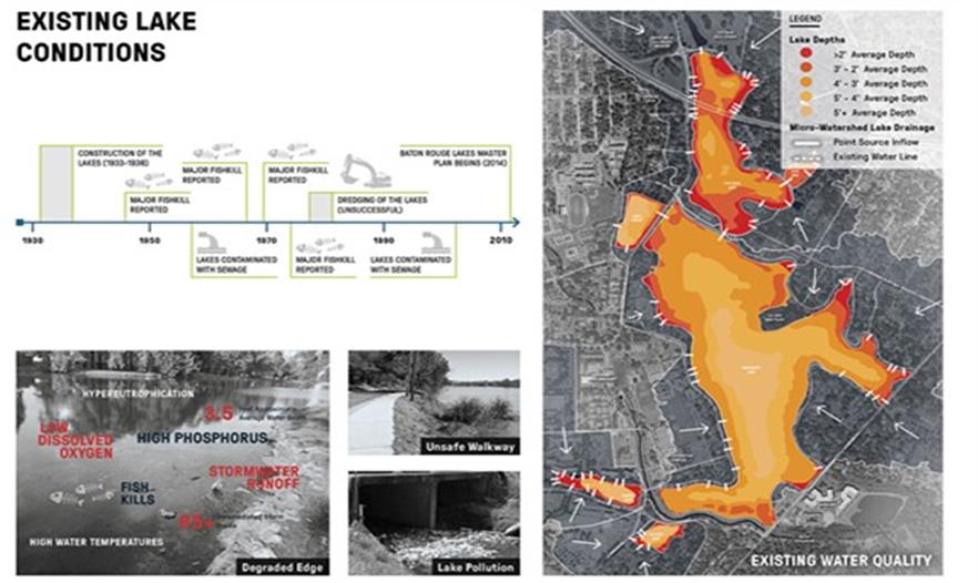 文化和歷史調(diào)查使設(shè)計師了解了原始區(qū)域生態(tài)、湖泊改造規(guī)劃、建造障礙以及河流的文化意義。與客戶、路易斯安那州立大學(xué)(LSU)和當(dāng)?shù)貧v史學(xué)家合作,事件時間表證明了湖泊現(xiàn)有的生態(tài)和社會問題。