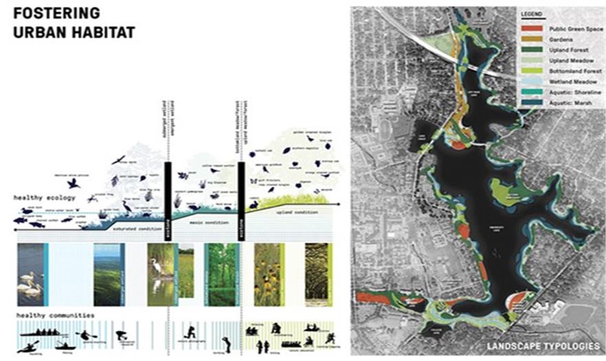 建造和再生繁茂的水生和陸地生態(tài)系統(tǒng),能夠自主維護,提高水質(zhì),建立野生動物習(xí)慣/生活圈,提供合理的公共進入