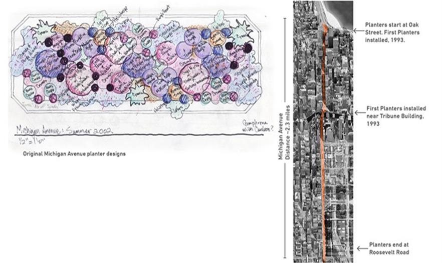 1993年,密歇根大道街景大大改觀了,開始時(shí)是在Crate & Barrel旗艦店前面放置了4個(gè)道路花壇。1991年,零售商第一次展出花壇,種滿不同形狀、規(guī)模和顏色的園藝植物和花。它們打破了壯麗大道灰色的城市基調(diào)——甚至市長(zhǎng)理查德?M?戴利也注意了。戴利(其遺留任務(wù)包括芝加哥公共空間的綠化)給Crate & Barrel公司的創(chuàng)辦者戈登?西格爾(Gordon Segal)咨詢花壇的事情:誰(shuí)設(shè)計(jì)的?成本是多少?西格爾有興趣將這種設(shè)計(jì)帶到密歇根大道中央隔離帶中嗎?就這樣,利用漂亮的景觀設(shè)計(jì)美化密歇根大道的合作開始了。