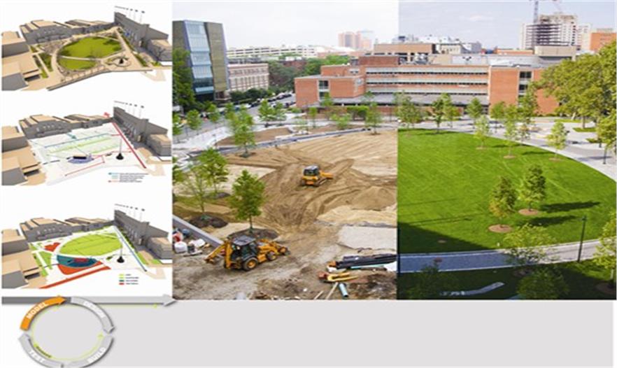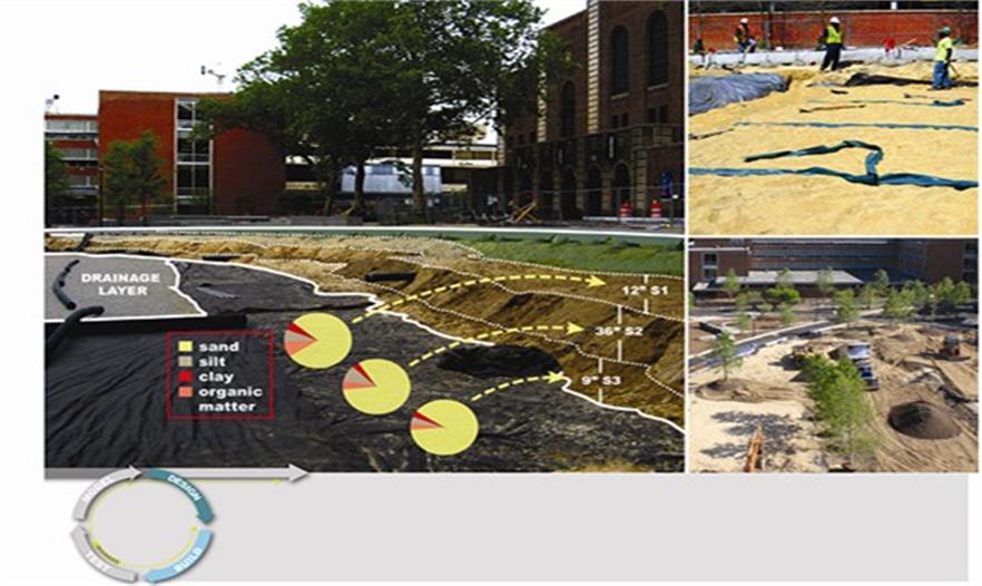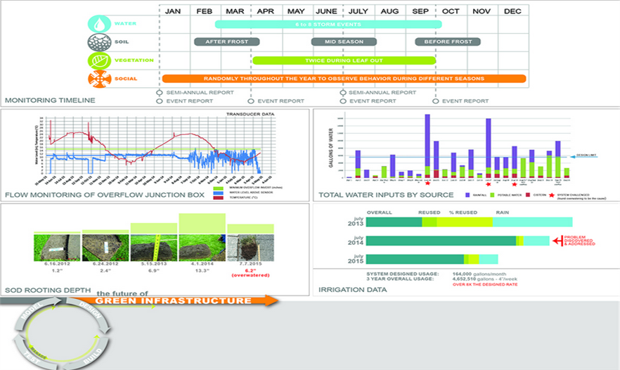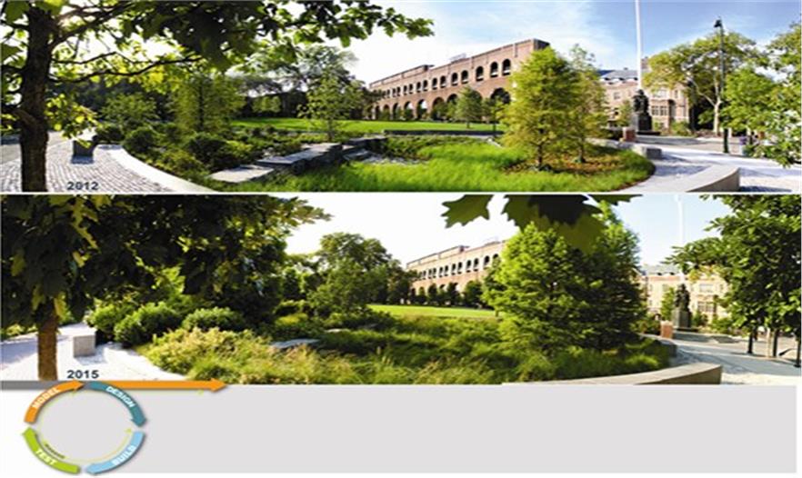 為了了解適應(yīng)性管理規(guī)劃下相互聯(lián)系的GSI元素“治理線”方法的性能,設(shè)計(jì)師-學(xué)術(shù)研究團(tuán)隊(duì)的合作展開了一項(xiàng)調(diào)查,對(duì)一個(gè)城市大學(xué)校園內(nèi)1公頃(2.75英畝)城市公園為期3年的研究。該項(xiàng)目目的是提供景觀監(jiān)測(cè)課程機(jī)會(huì),為專業(yè)人士和管理層提供這些區(qū)域收集的GSI性能數(shù)據(jù)。通過建立學(xué)術(shù)、政府和設(shè)計(jì)專業(yè)人士的合作團(tuán)隊(duì),這個(gè)區(qū)域水平的調(diào)查已提供了時(shí)態(tài)數(shù)據(jù),幫助研究團(tuán)隊(duì)更好地了解以性能為基礎(chǔ)的景觀設(shè)計(jì),建立適應(yīng)性管理循環(huán)圈,了解景觀管理實(shí)踐,維持或改善這些系統(tǒng)的性能。