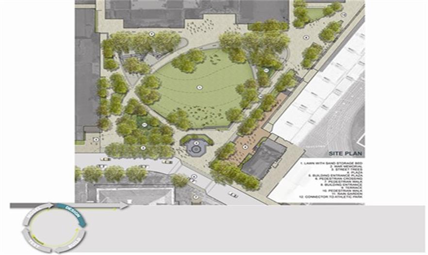綜合性的GSI設(shè)計(jì):該公園設(shè)計(jì)采用了治理線方法,將工程土壤、精心選擇的植物配置與雨水再利用灌溉系統(tǒng)結(jié)合起來。該地區(qū)大部分的降水通過GSI系統(tǒng)處理,包括: