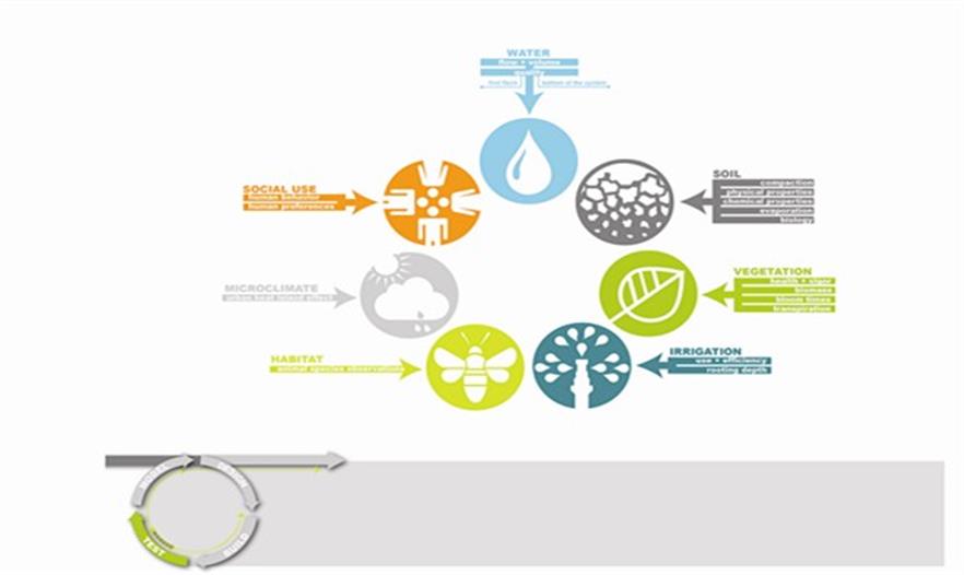 初始數(shù)據(jù)顯示當(dāng)設(shè)計(jì)GSI系統(tǒng)時(shí),水應(yīng)該儲(chǔ)存在根際里,這樣就能讓土壤和植被盡可能的蒸發(fā)水,卻不影響植物健康?;厥沼晁涂照{(diào)冷凝水的灌溉系統(tǒng)以及通過植被覆蓋系統(tǒng)產(chǎn)生的循環(huán)水會(huì)進(jìn)一步促進(jìn)水的蒸發(fā)。