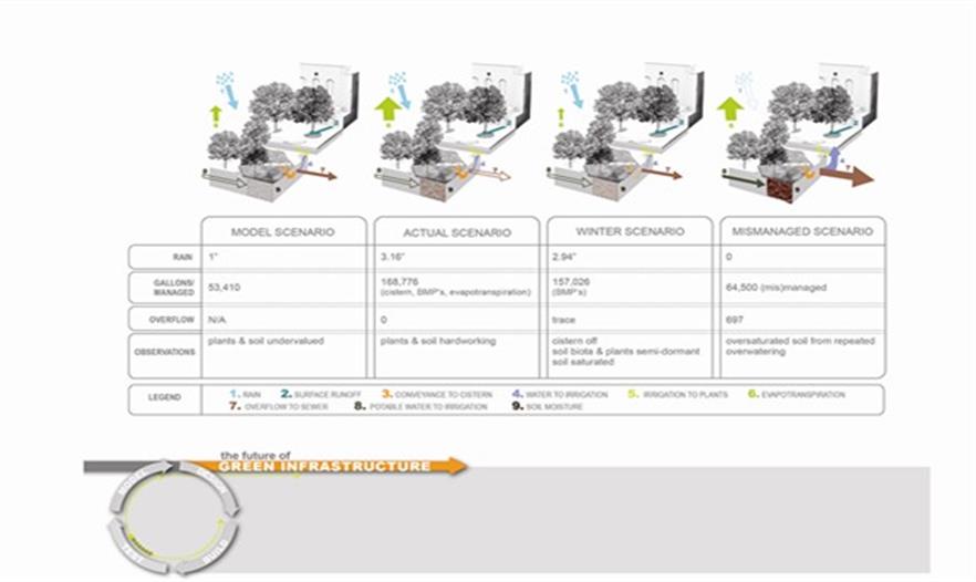 當(dāng)?shù)赜晁芾矸ㄒ?guī)要求的工程模型不會(huì)考慮該公園的工程土壤(具有高水位儲(chǔ)存能力);高性能植被(通過蒸發(fā)提供顯著的吸水性能);或是雨水再利用灌溉系統(tǒng)(水箱回收的水用于灌溉該公園的植被)。2013年6月7日的降水是研究階段中最大的降水活動(dòng),有7.9厘米(3.14英寸)。在降水期間,沒有出現(xiàn)聯(lián)合性下水道溢流現(xiàn)象,即使工程模型最大的雨水捕獲量是2.5厘米(1英寸)。