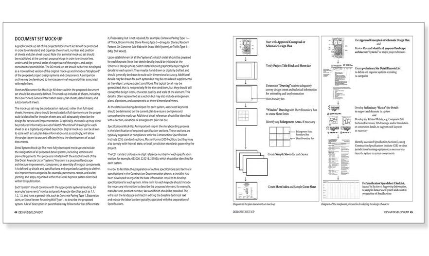 目標(biāo):該書是一本參考書,聚焦對景觀建筑設(shè)計和施工文檔程序的文檔需求。其包括“設(shè)計文檔”和“施工文檔”,以及從一個領(lǐng)域過渡到另一個領(lǐng)域的所進(jìn)行的活動。文檔要求包括這些所需的元素,探索和明確設(shè)計分析、目的、邏輯、實際方案,而詳細(xì)元素包括在施工和投標(biāo)文檔中。