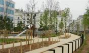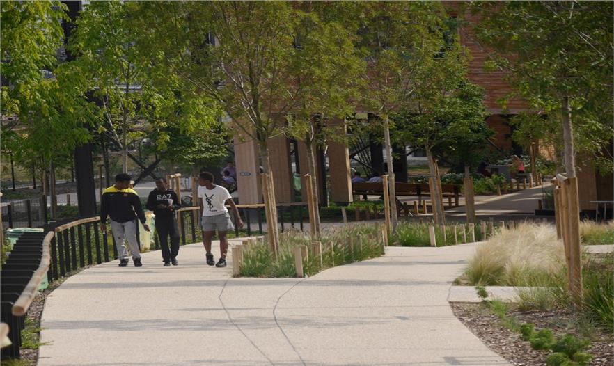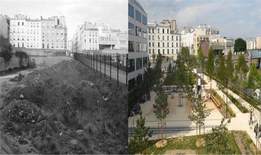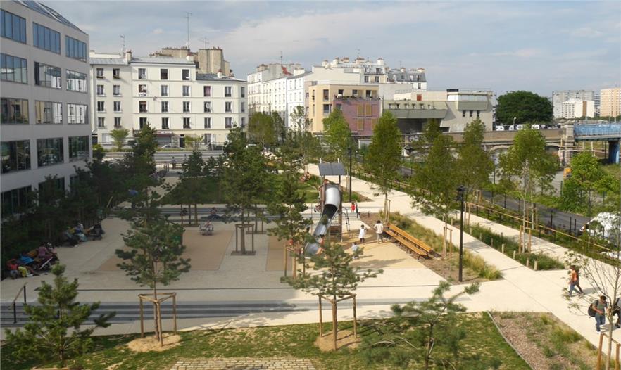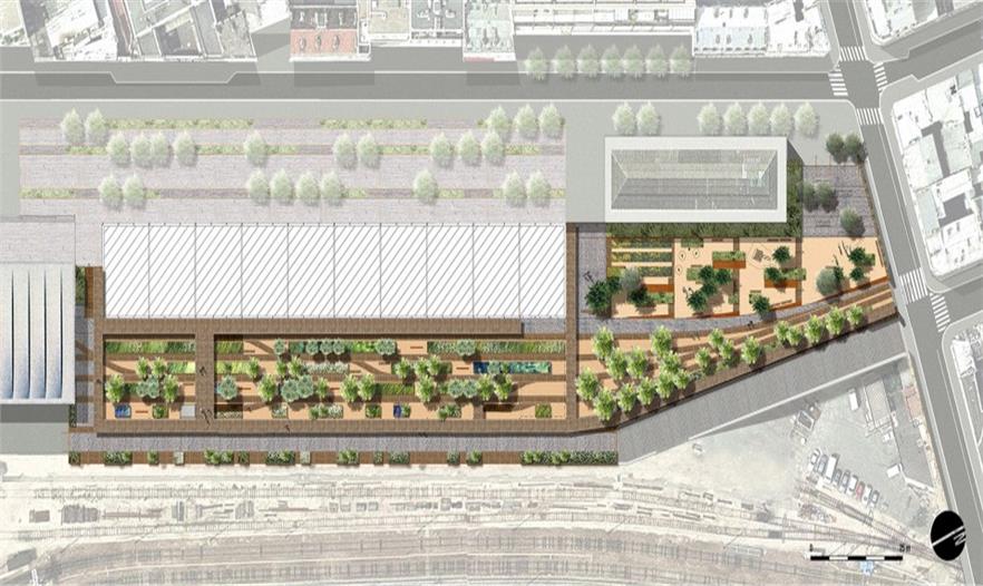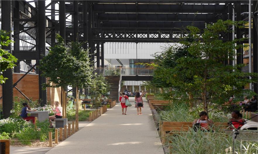 坐落于巴黎18區(qū)的Rosa Luxemburg公園沿著Gare de l’Est鐵路向南北延伸,形成了一個細長而連續(xù)的公園空間。公園分為南北兩個部分,南側公園半掩于由曾經的貨運倉庫改建而來的商業(yè)中心Halle Pajol的玻璃頂棚之下,形成了一片不受風雨影響的公共空間。
