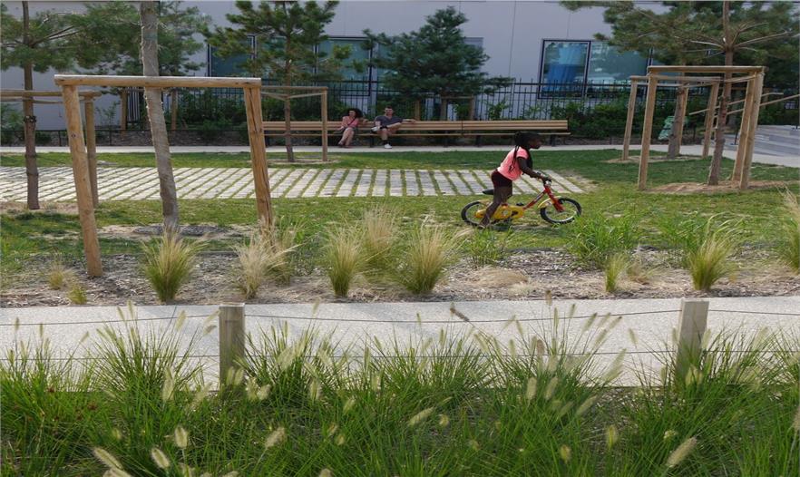 北側的露天公園則與毗鄰的社區(qū)街道相連,由法國建筑師Fran?oise-Hélène Jourda所設計,層層疊落的臺地中錯落地布置著成排的座椅,草坪以及游戲空間。臺地之上,是星星點點的歐洲赤松,而在南北向延伸的小路旁則是整齊排列的白蠟樹。狹長的小路如同鐵道一般,串聯(lián)起Halle Pajol玻璃頂棚以及圖書館下方的空間。